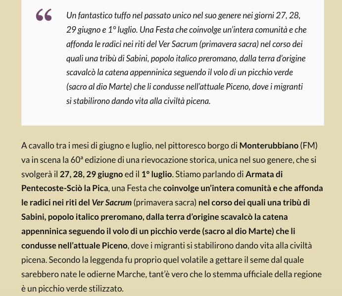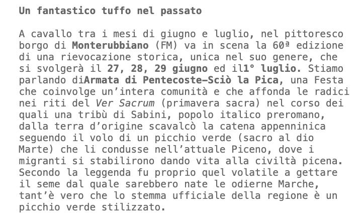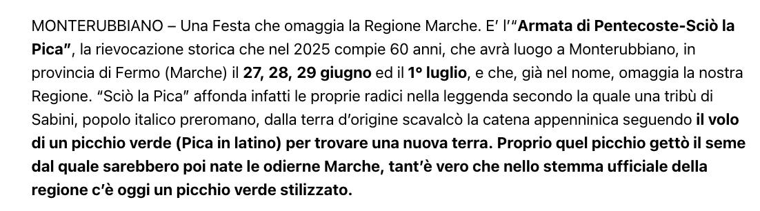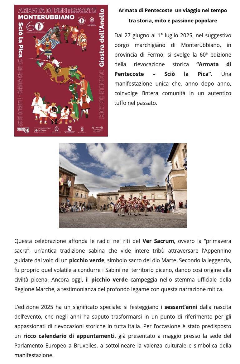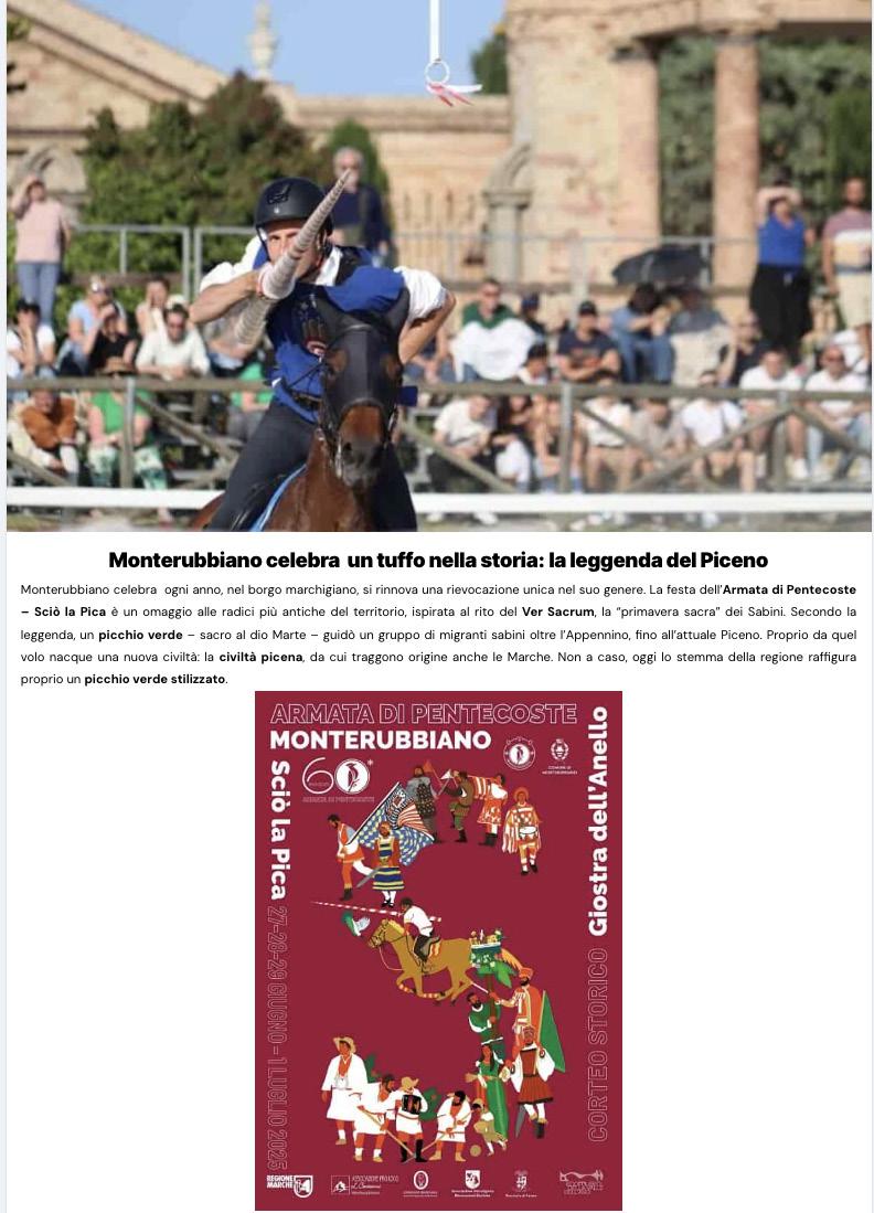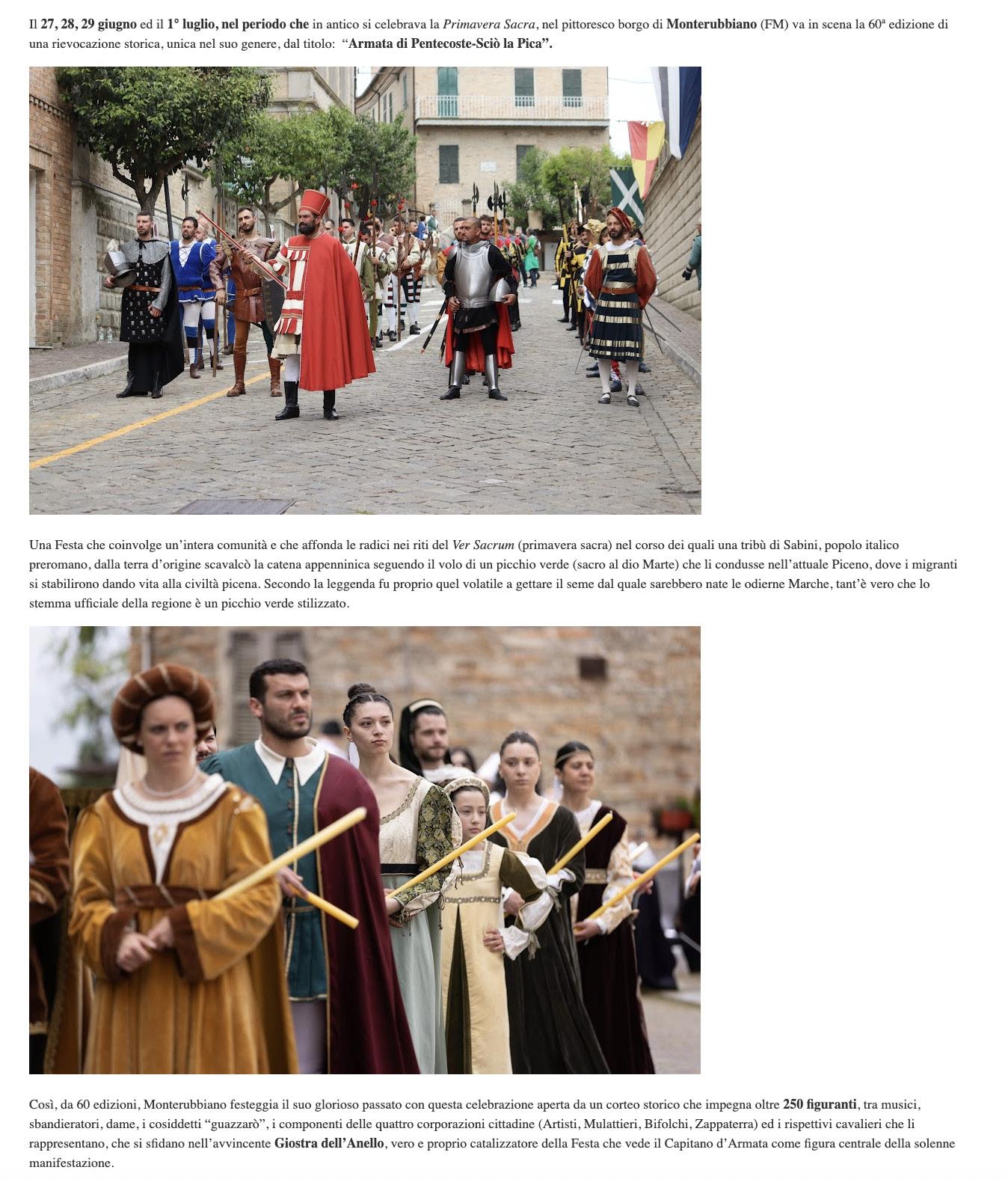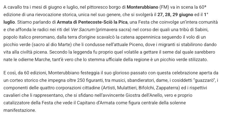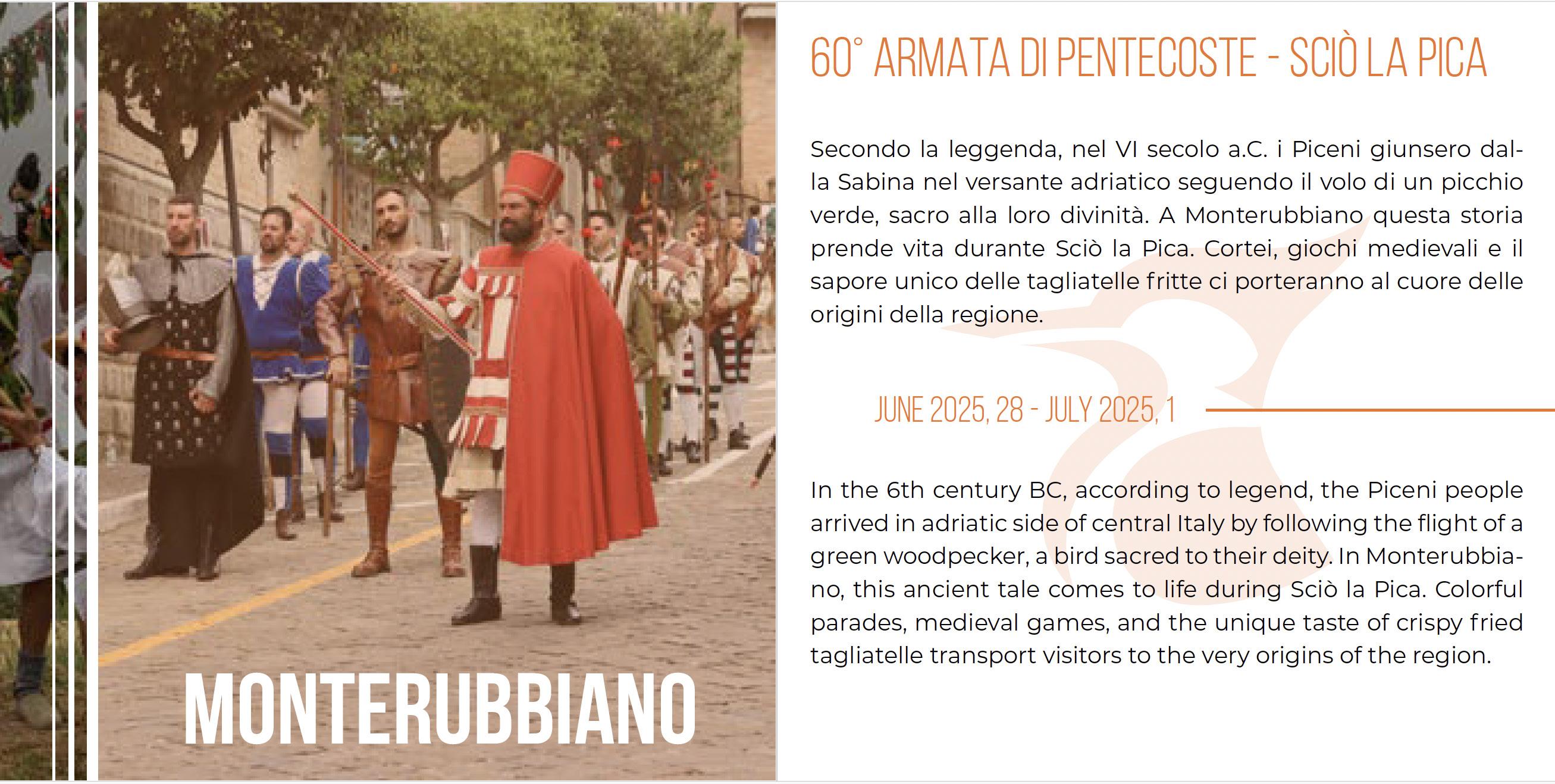 A cavallo tra i mesi di giugno e luglio, nel pittoresco borgo di Monterubbiano (FM) va in scena la 60ª edizione di una rievocazione storica, unica nel suo genere, che si svolgerà il 27, 28, 29 giugno ed il 1° luglio. Stiamo parlando di Armata di Pentecoste-Sciò la Pica, una Festa che coinvolge un’intera comunità e che affonda le radici nei riti del Ver Sacrum (primavera sacra) nel corso dei quali una tribù di Sabini, popolo italico preromano, dalla terra d’origine scavalcò la catena appenninica seguendo il volo di un picchio verde (sacro al dio Marte) che li condusse nell’attuale Piceno, dove i migranti si stabilirono dando vita alla civiltà picena. Secondo la leggenda fu proprio quel volatile a gettare il seme dal quale sarebbero nate le odierne Marche, tant’è vero che lo stemma ufficiale della regione è un picchio verde stilizzato.