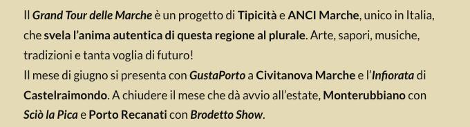 Il Grand Tour delle Marche è un progetto di Tipicità ed ANCI Marche, unico in Italia, che svela l’anima autentica di questa regione al plurale. Arte, sapori, musiche, tradizioni e tanta voglia di futuro!