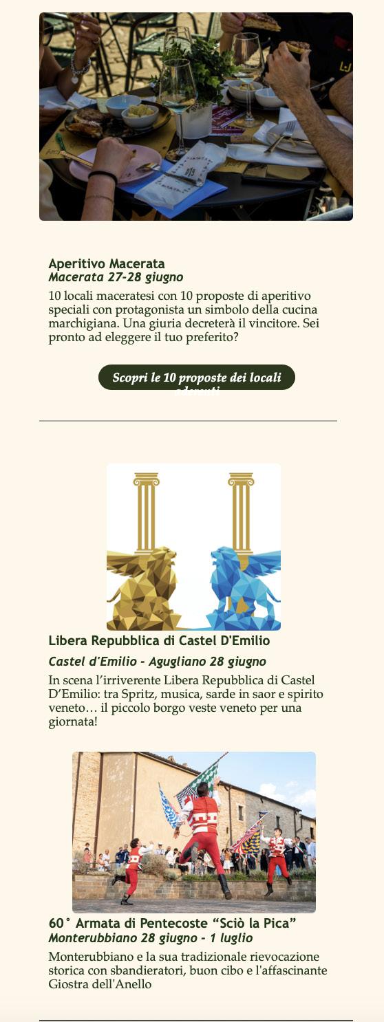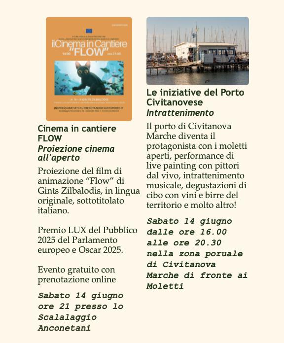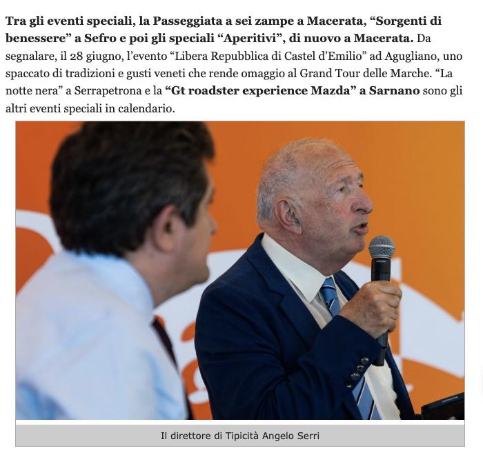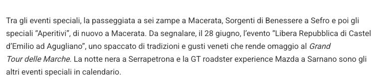 Tra gli eventi speciali, la passeggiata a sei zampe a Macerata, Sorgenti di Benessere a Sefro e poi gli speciali “Aperitivi”, di nuovo a Macerata. Da segnalare, il 28 giugno, l’evento “Libera Repubblica di Castel d’Emilio ad Agugliano”, uno spaccato di tradizioni e gusti veneti che rende omaggio al Grand Tour delle Marche. La notte nera a Serrapetrona e la GT roadster experience Mazda a Sarnano sono gli altri eventi speciali in calendario.