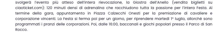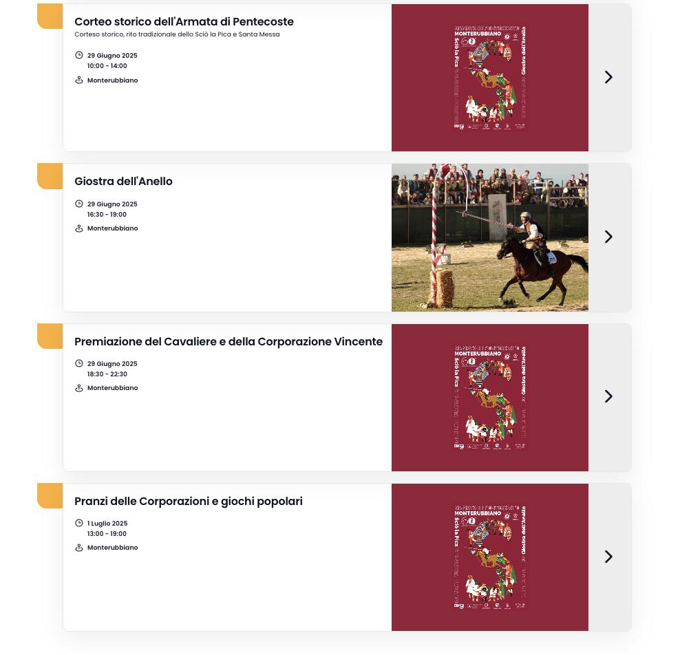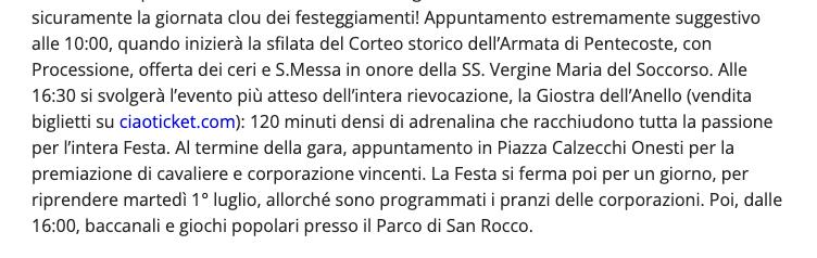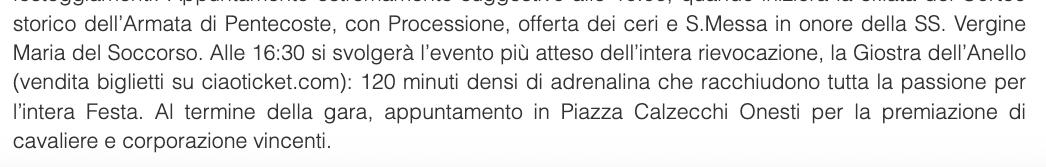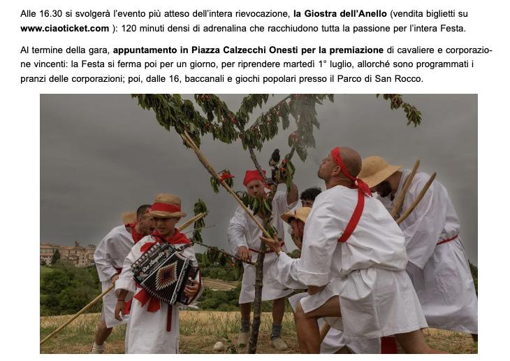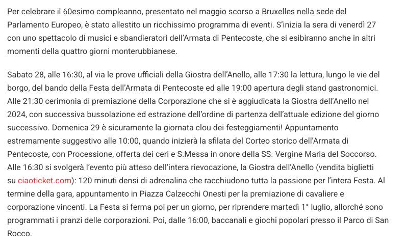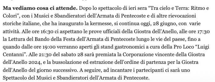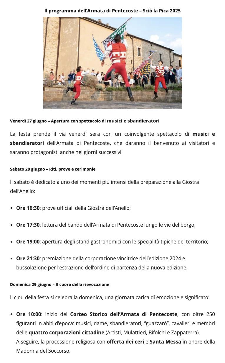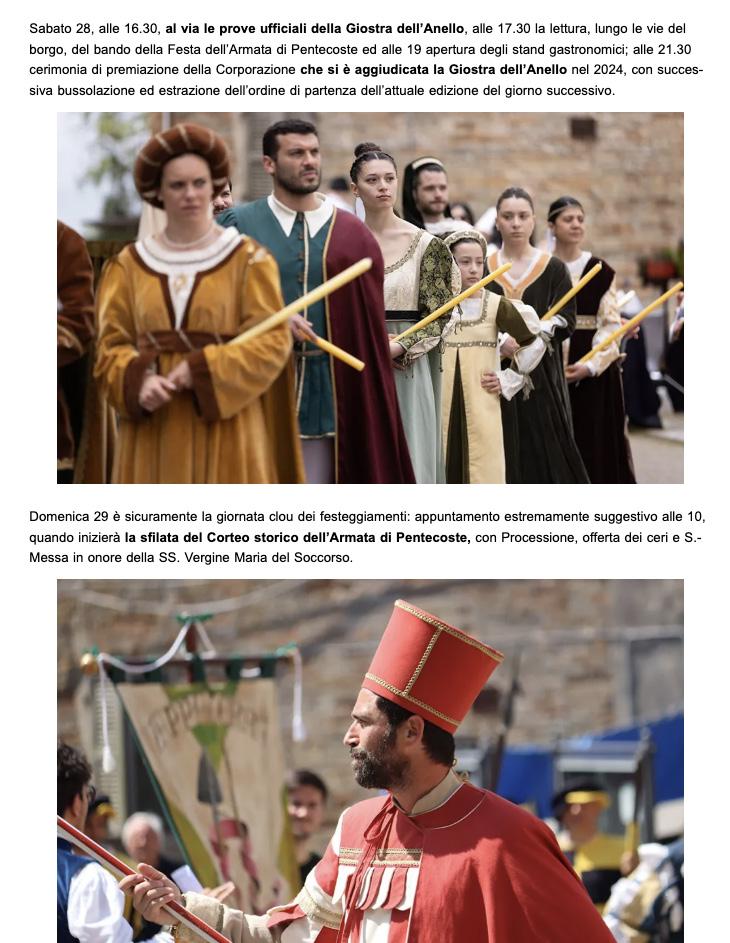 Sabato 28, alle 16:30, al via le prove ufficiali della Giostra dell’Anello, alle 17:30 la lettura, lungo le vie del borgo, del bando della Festa dell’Armata di Pentecoste ed alle 19:00 apertura degli stand gastronomici. Alle 21:30 cerimonia di premiazione della Corporazione che si è aggiudicata la Giostra dell’Anello nel 2024, con successiva bussolazione ed estrazione dell’ordine di partenza dell’attuale edizione del giorno successivo. Domenica 29 è sicuramente la giornata clou dei festeggiamenti! Appuntamento estremamente suggestivo alle 10:00, quando inizierà la sfilata del Corteo storico dell’Armata di Pentecoste, con Processione, offerta dei ceri e S.Messa in onore della SS. Vergine Maria del Soccorso. Alle 16:30 si svolgerà l’evento più atteso dell’intera rievocazione, la Giostra dell’Anello (vendita biglietti su ciaoticket.com): 120 minuti densi di adrenalina che racchiudono tutta la passione per l’intera Festa. Al termine della gara, appuntamento in Piazza Calzecchi Onesti per la premiazione di cavaliere e corporazione vincenti. La Festa si ferma poi per un giorno, per riprendere martedì 1° luglio, allorché sono programmati i pranzi delle corporazioni Poi, dalle 16:00, baccanali e giochi popolari presso il Parco di San Rocco.