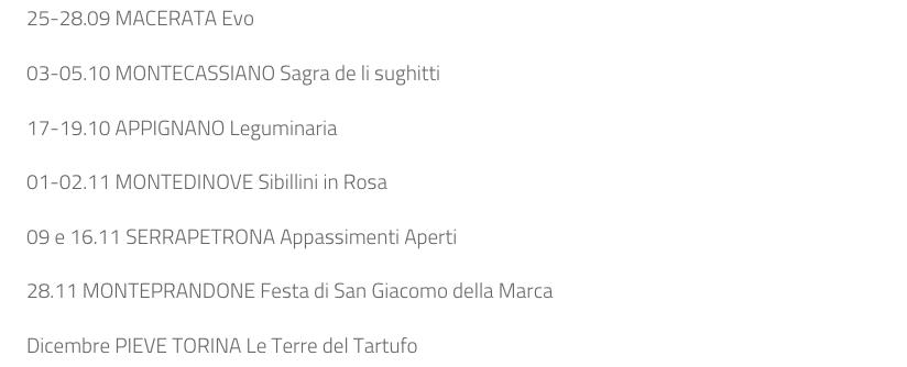 Settembre si apre con la Festa del Ciauscolo e del salame spalmabile a Sarnano, per poi trasferirsi a Castelfidardo in occasione del Premio Internazionale della Fisarmonica. Sempre a settembre anche il Grappolo d’Oro a Potenza Picena ed EVO a Macerata.