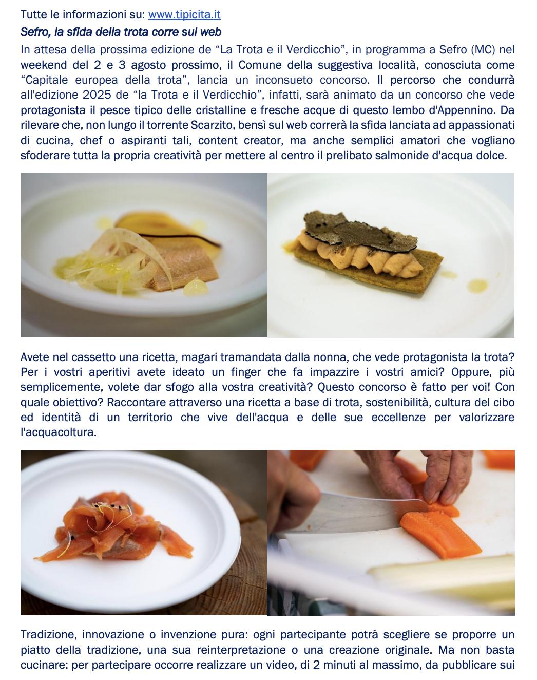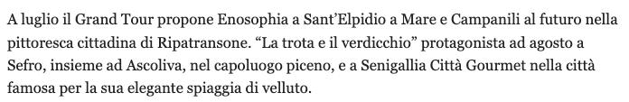 A luglio il Grand Tour propone Enosophia a Sant’Elpidio a Mare e Campanili al futuro nella pittoresca cittadina di Ripatransone. “La trota e il verdicchio” protagonista ad agosto a Sefro, insieme ad Ascoliva, nel capoluogo piceno, e a Senigallia Città Gourmet nella città famosa per la sua elegante spiaggia di velluto.