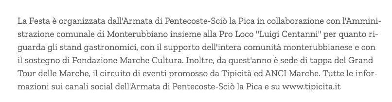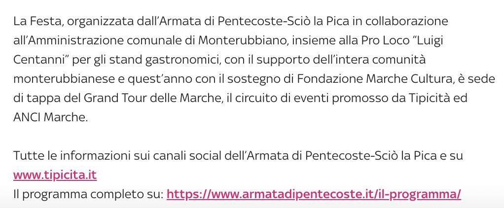 La Festa è organizzata dall’Armata di Pentecoste-Sciò la Pica in collaborazione con l’Amministrazione comunale di Monterubbiano insieme alla Pro Loco “Luigi Centanni” per quanto riguarda gli stand gastronomici, con il supporto dell’intera comunità monterubbianese e con il sostegno di Fondazione Marche Cultura. Inoltre, da quest’anno è sede di tappa del Grand Tour delle Marche, il circuito di eventi promosso da Tipicità ed ANCI Marche. Tutte le informazioni sui canali social dell’Armata di Pentecoste-Sciò la Pica e su www.tipicita.it