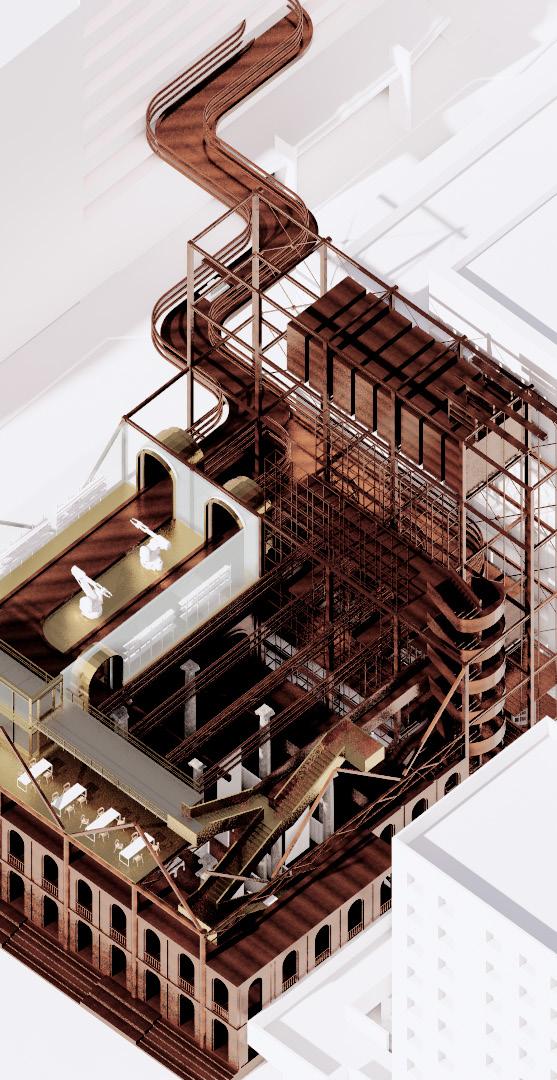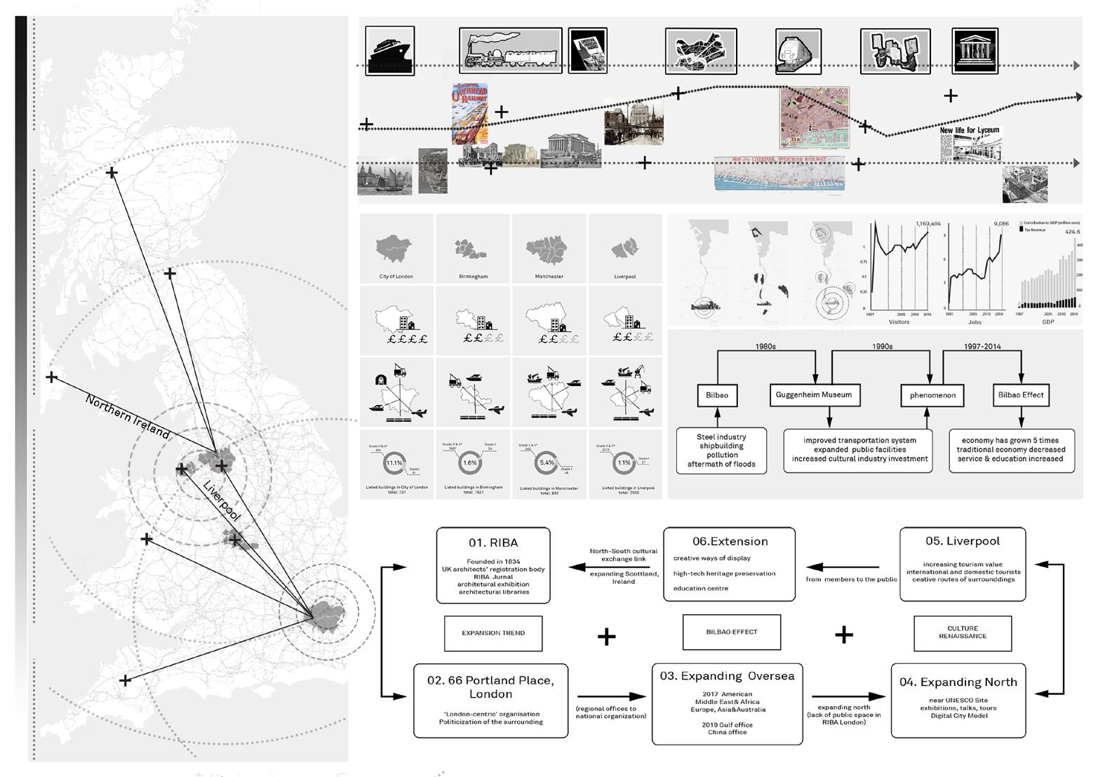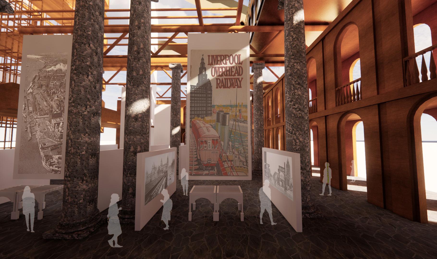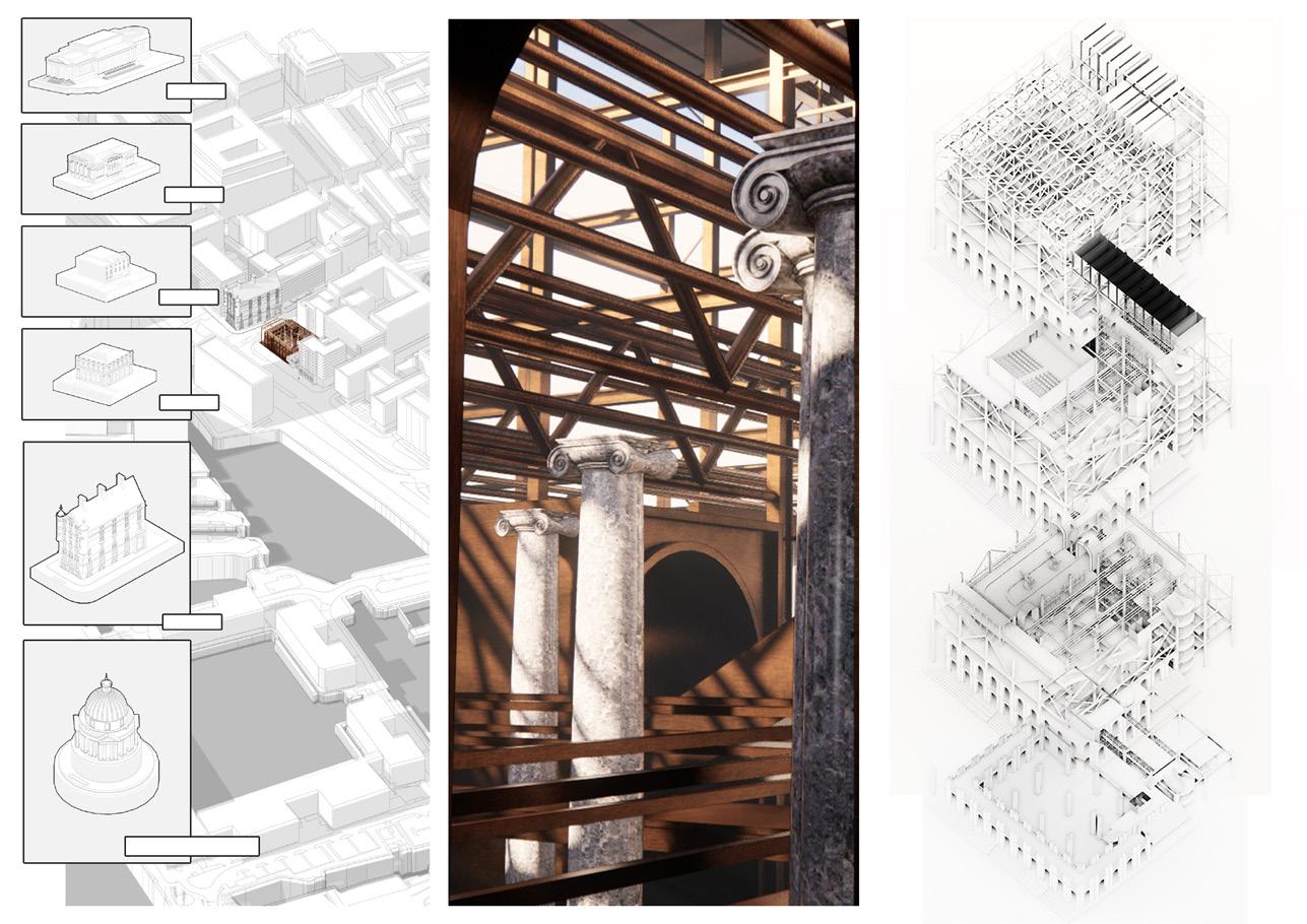 the project provides an architectural showroom extension to RIBA headquarters in london, in line with RIBA's expansion plans, the showroom in liverpool includes a strong ongoing character, on tracks linking with the railway station, transporting traffic from all over the country architectural fragments, digitally storing them through Liverpool Palace, and providing an interesting exhibition and showing architectural techniques for preserving recreating