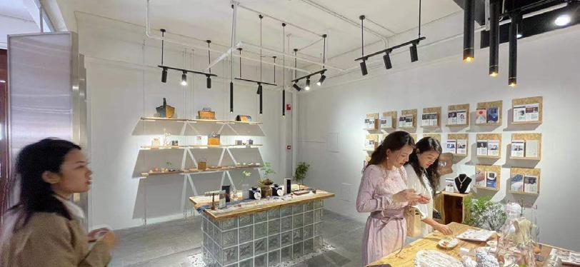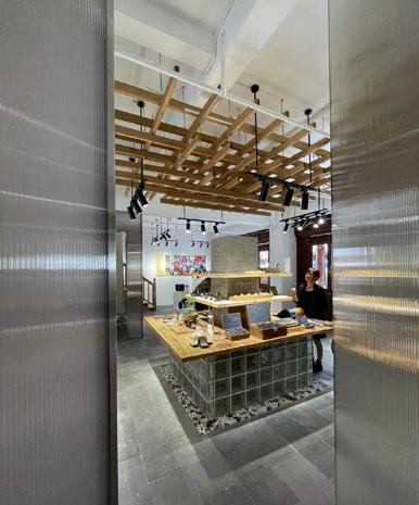 For the original design brand's new shop in Lijiang Old Town, we used lower cost glass bricks, concrete pillars and eco-friendly wood panels at the request of our client. The whole space is bright and smooth, allowing customers to find their favorite accessories among the translucent bricks.