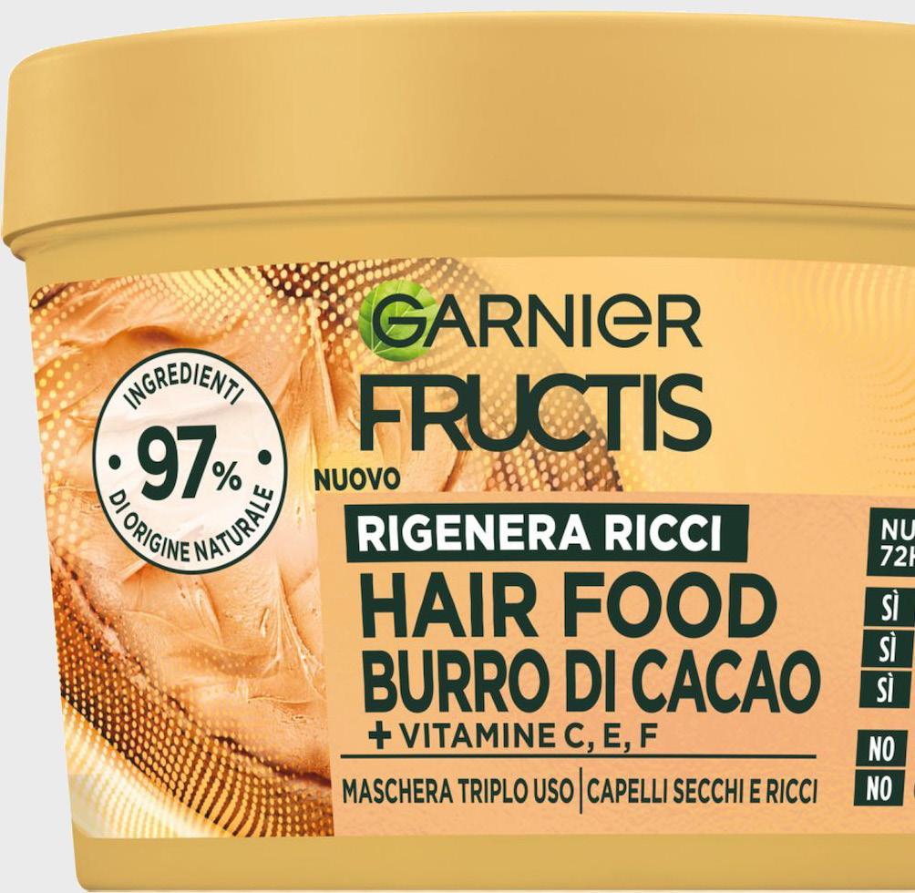 Più di una maschera perché non si limita a idratare, nutrire e illuminare la chioma: Fructis Hair Food Burro di Cacao vanta una texture profumatissima che prome e capelli ricci definiti fino a 72 ore. Così