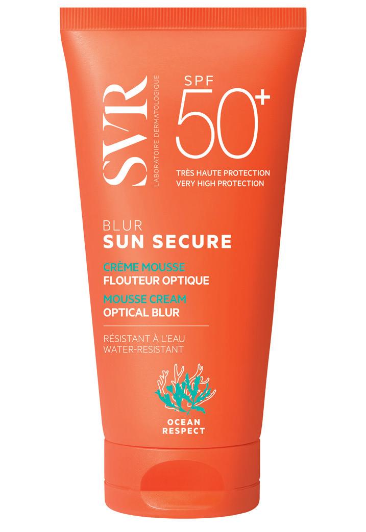 Sun Secure Blur Spf 50+ senza profumazione, ha una texture in mousse leggermente colorata che si assorbe velocemente per perfezionare l’incarnato con effetto pelle nuda. Protegge anche dalla luce blu. Distribuito da SVR.