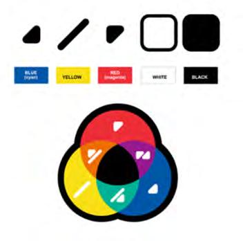 Una vez que me cuestioné lo anterior, no pude evitar investigar si existía alguna forma en la que ese nicho de la población fuera considerado en términos cromáticos, y fue entonces que descubrí el código de color Color Add (2010). Este código fue creado por Miguel Neiva, quien ha buscado emplearlo como ayuda a las personas con daltonismo, para diferenciar los colores en su vida cotidiana. Éste se conforma de la siguiente manera: