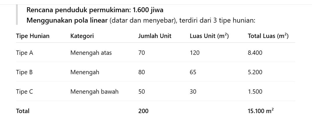 Perkembangan jumlah penduduk dan urbanisasi yang pesat di Indonesia menimbulkan tantangan besar dalam penyediaan hunian yang layak, terjangkau, dan berkelanjutan. Kebutuhan akan kawasan permukiman yang tidak hanya memenuhi aspek fisik bangunan, tetapi juga aspek sosial, lingkungan, dan ekonomi menjadi semakin mendesak. Permukiman sebagai elemen dasar pembentukan kota harus dirancang secara terpadu agar mampu menunjang kehidupan masyarakat yang sehat, produktif, dan harmonis dengan lingkungannya.