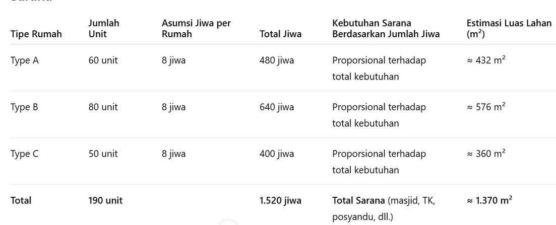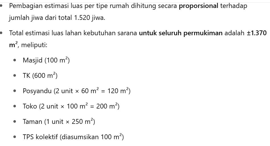 Pembagian estimasi luas per tipe rumah dihitung secara proporsional terhadap jumlah jiwa dari total 1.520 jiwa.