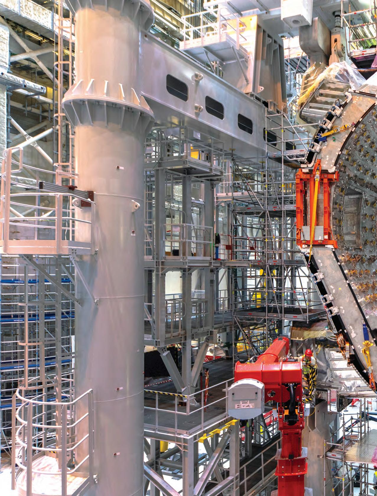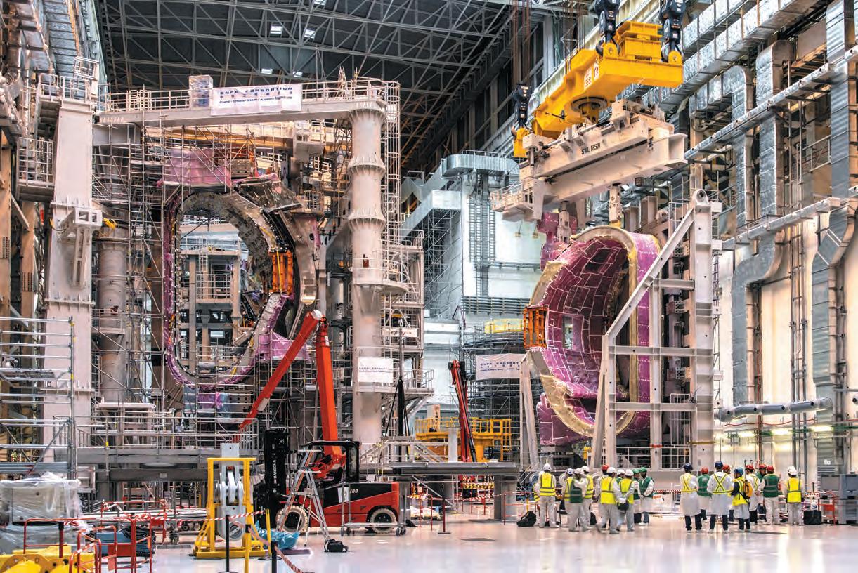 Once modules are ready for assembly, a short crane ride awaits. In a process that can take 36 hours, a ceilingmounted crane lifts the 1,350-tonne parts up, across the assembly hall wall and above the adjacent tokamak pit. They are then gently lowered into the pit, with work pausing whenever
