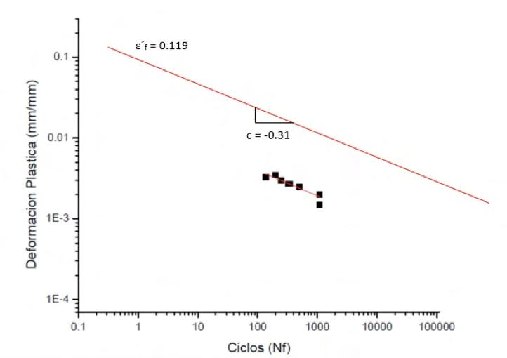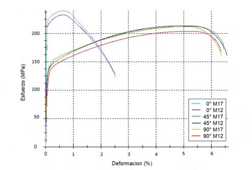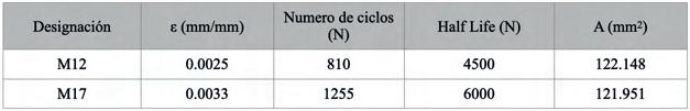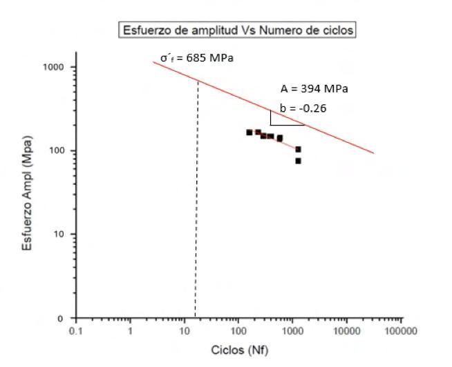 En la figura 15 se presenta la curva S-N para la aleación AA6061 fabricada SLM y construida en la dirección XY, se ensayaron a esfuerzo de fluencia alrededor de los de 170 MPa y 350 MPa se rompió antes de alcanzar los 6000 de ciclos para la muestra 17. AA6061 después de varios tratamientos térmicos y AA6061 fabricado y tratado térmicamente con la condición TT (T6), la muestra 17 presenta el alargamiento más elevado, de hasta el 15%.
