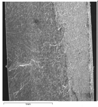 Las fractografía de la Figura 16 corresponde a la fractura de la aleación de AA6061 con bajo número de ciclos. Esta fractura se inicia en el borde de la muestra y genera una fractura dúctil, este defecto podría haberse ocasionado en los poros de la interfase metal- oxido, que actuarían como desencadenantes de la cohesión entre el metal y el óxido, dando lugar a grietas que favorecerían la rápida propagación de la fractura en el material.