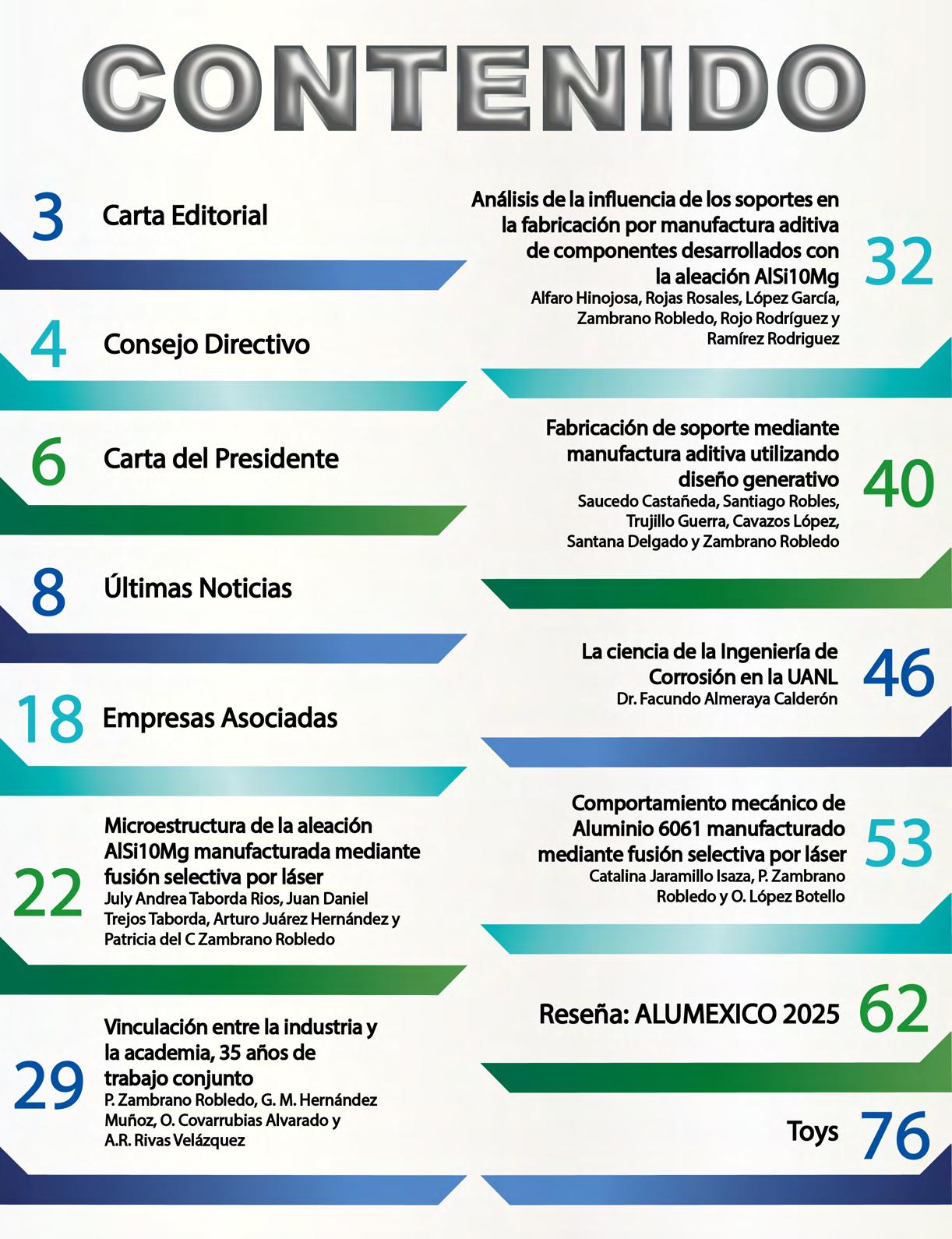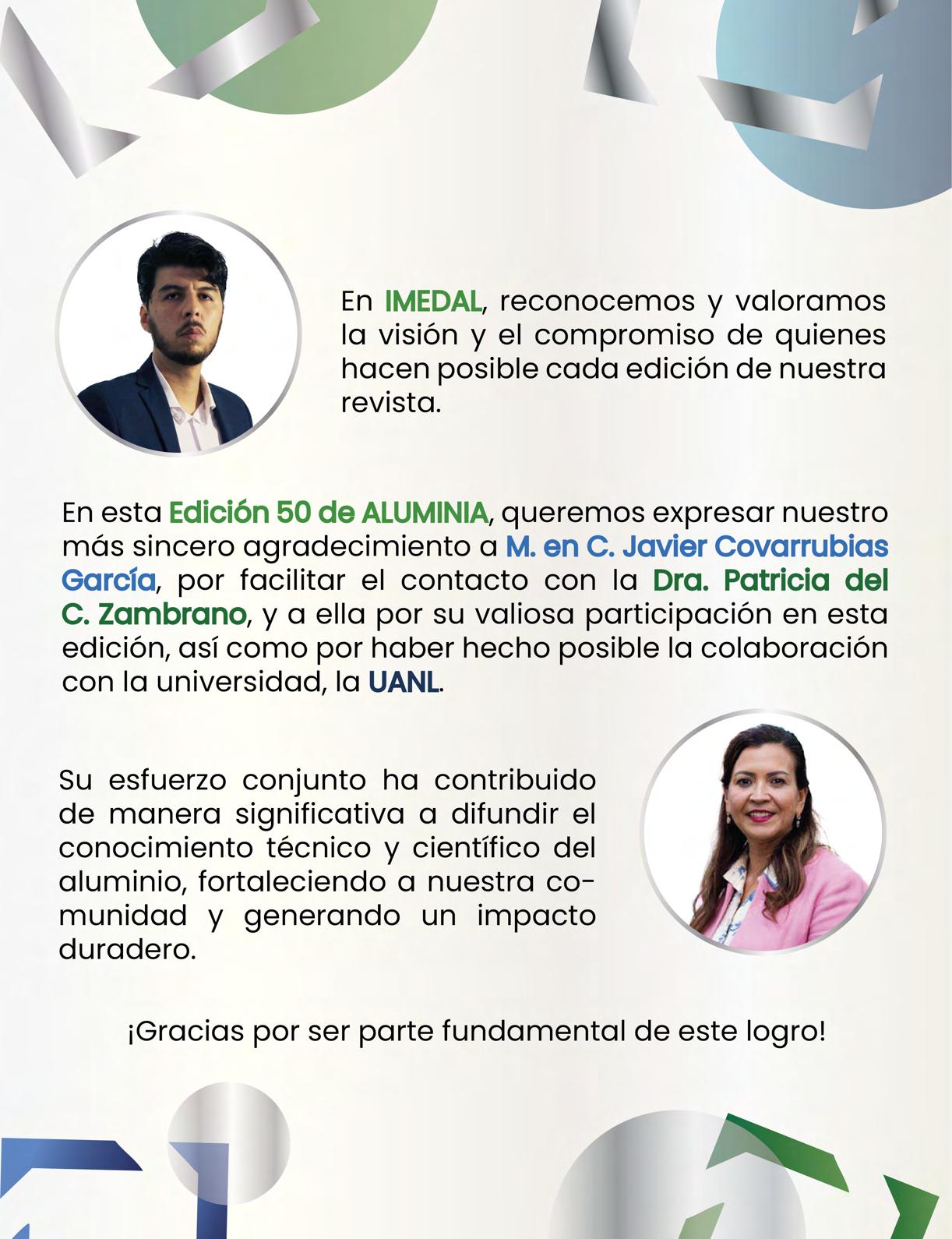 En esta edición adicional agradecer y reconocer al Mtro. Javier Covarrubias por el acercamiento y coordinación con todos los articulistas que han escrito en esta edición. Javier muchas gracias por tu interés en que sigamos creciendo y alcanzando muchos más amantes de este tan valioso metal nuestro ALUMINIO.