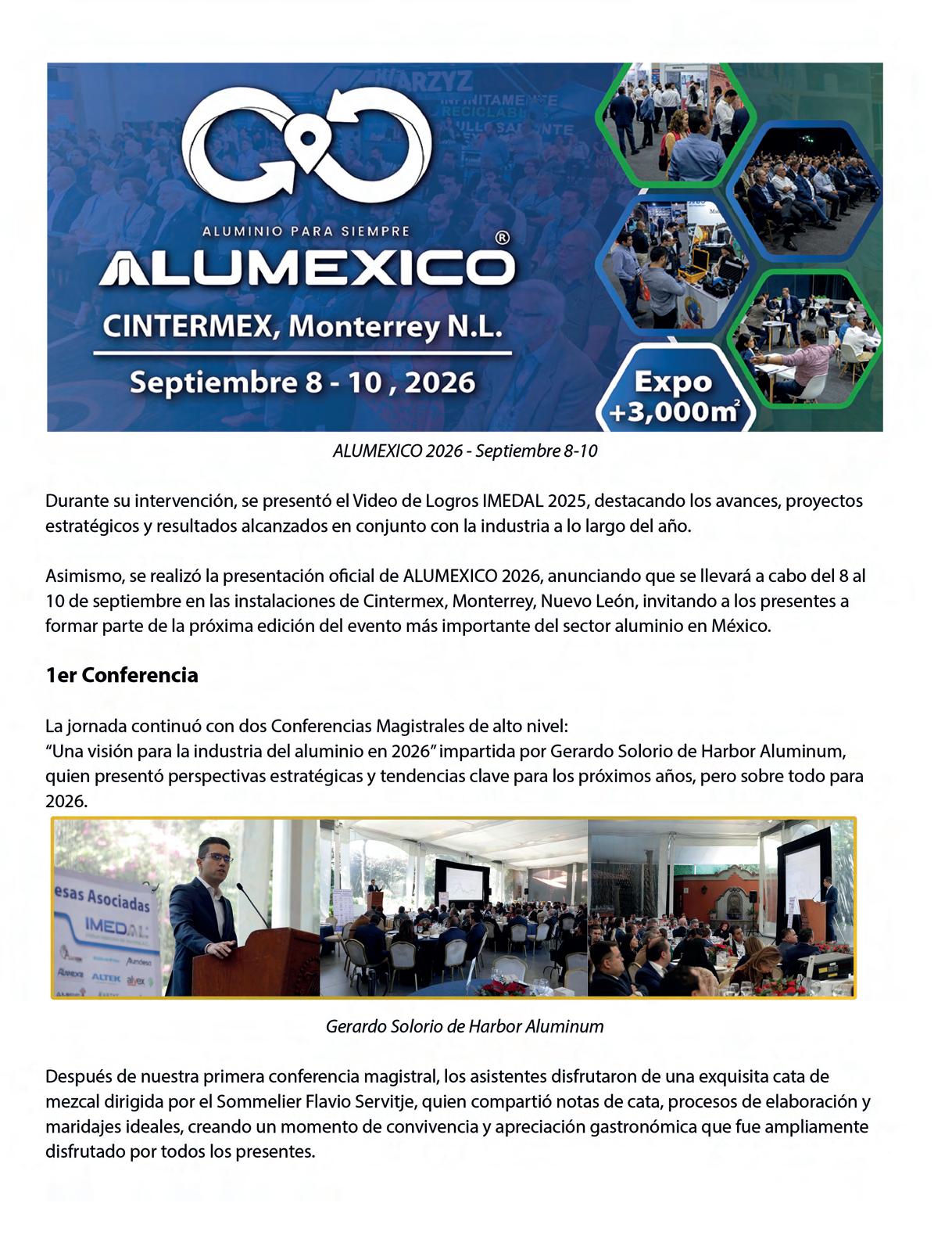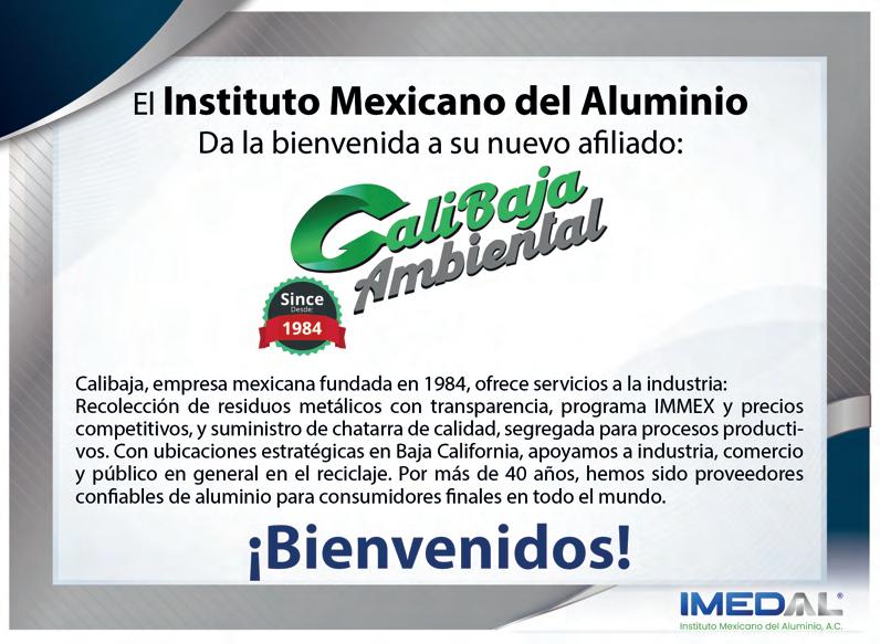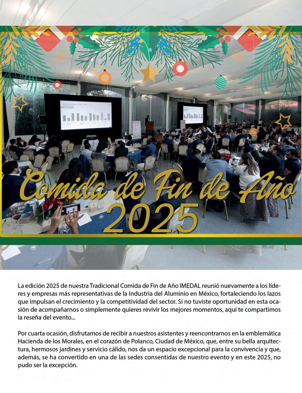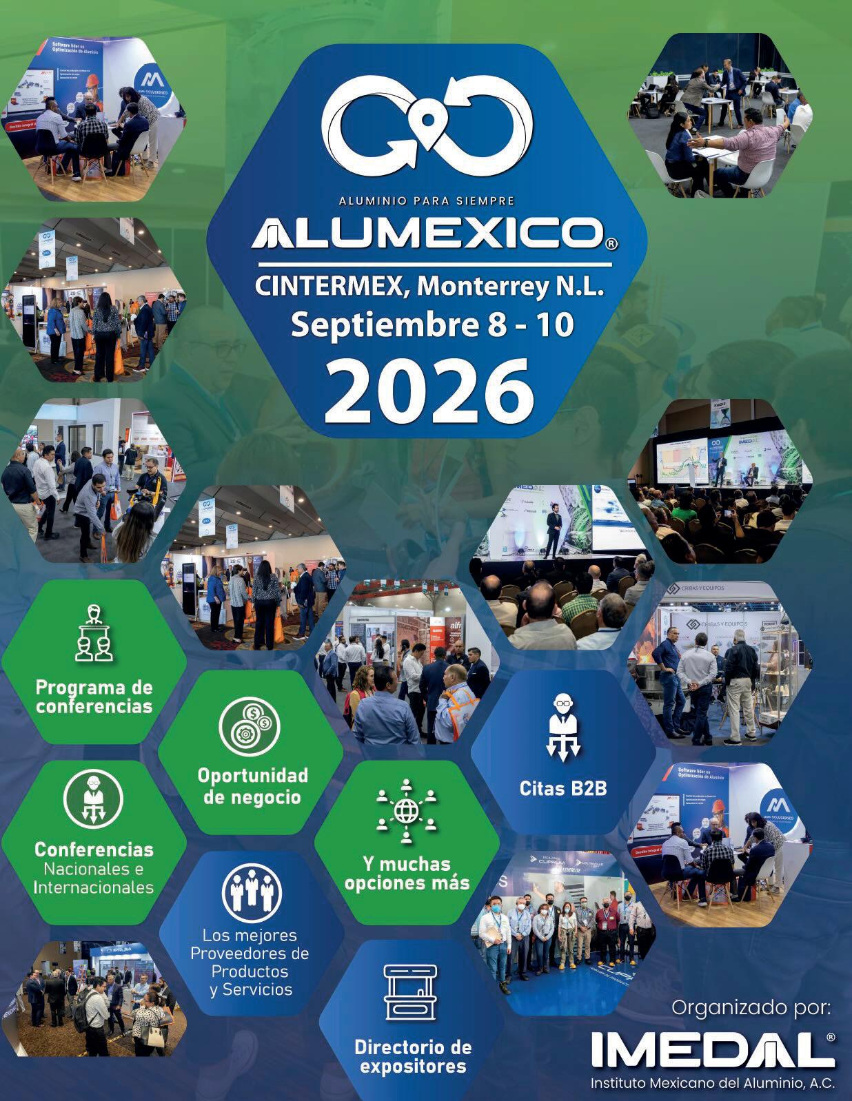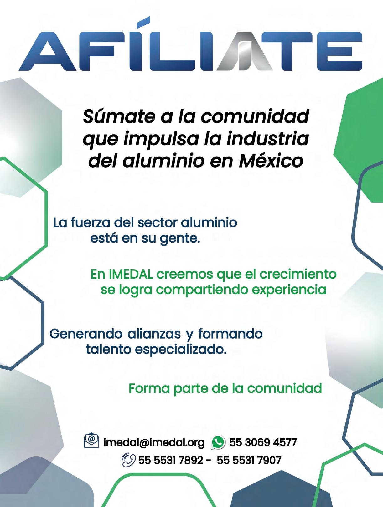 ALUMINIA, año 17, No. 51, Octubre 2025 - Enero 2026, es una publicación cuatrimestral editada por el Instituto Mexicano del Aluminio A.C., calle Francisco Petrarca, 133 Piso 9, Col. Polanco, Alcaldía Miguel Hidalgo, C.P. 11560, Tel: (55) 5531-7892, www.imedal.org, imedal@imedal.org Editor responsable: Ing. Artemisa Alba Aguilar. Reserva de Derechos al Uso Exclusivo No. 04-2023-081817081400102 otorgado por el Instituto Nacional del Derecho de Autor, ISSN: 2992-8729 ante el Instituto Nacional del Derecho de Autor. Responsable de la última actualización de este Número, Directora Ejecutiva, Ing. Artemisa Alba Aguilar calle Francisco Petrarca, 133 Piso 9, Col. Polanco, Alcaldía Miguel Hidalgo, C.P. 11560, fecha de última modificación, 5 de diciembre de 2025.