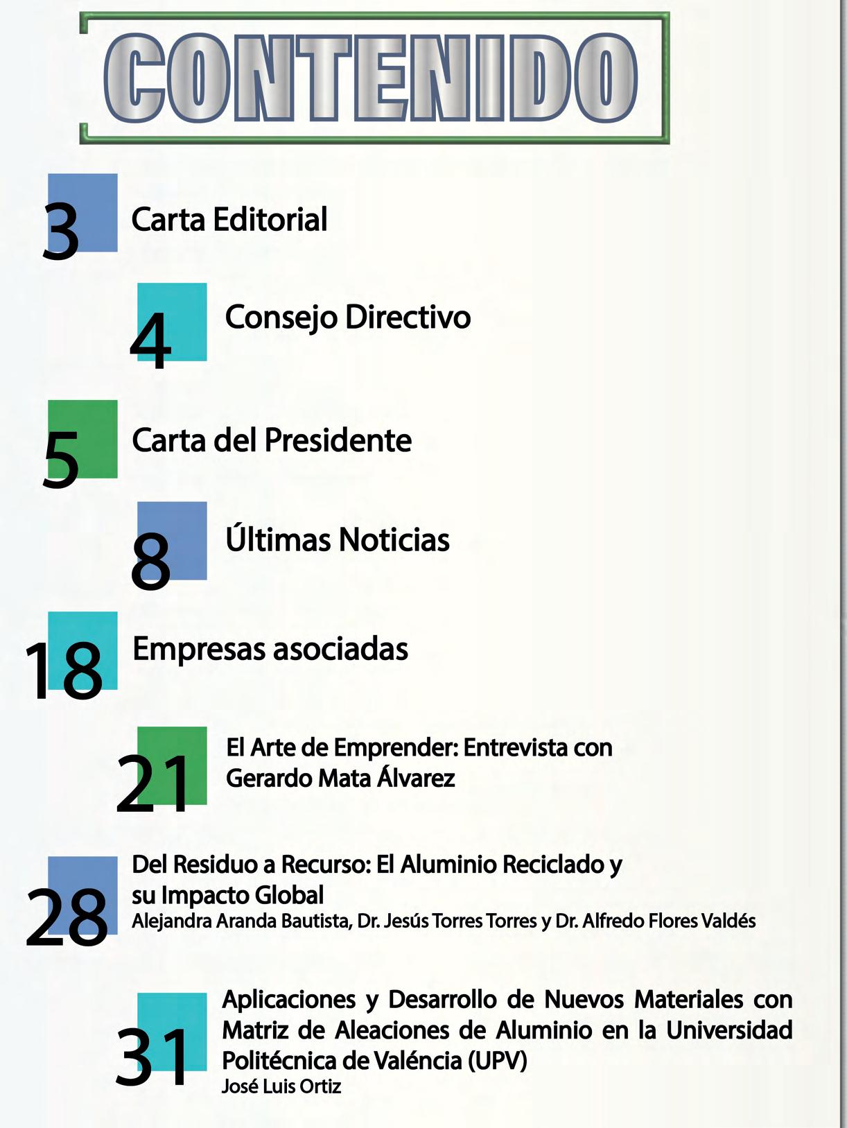 Nueve valiosos artículos y una reseña exclusiva convergen en este número, ofreciendo una visión integral y de vanguardia, y retomando en esta edición nuestra sección de Trayectorias donde, en esta ocasión, disfrutaremos el relato del: Arte de emprender donde a través de la entrevista realizada al Lic. Gerardo Mata, nos narra su trayectoria en la industria del aluminio desde AZINSA.