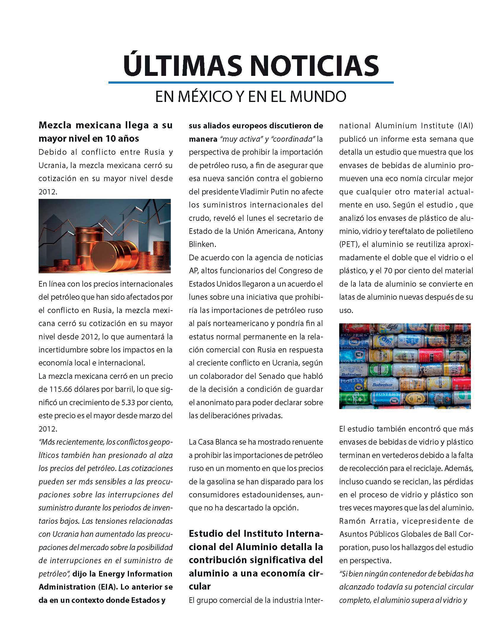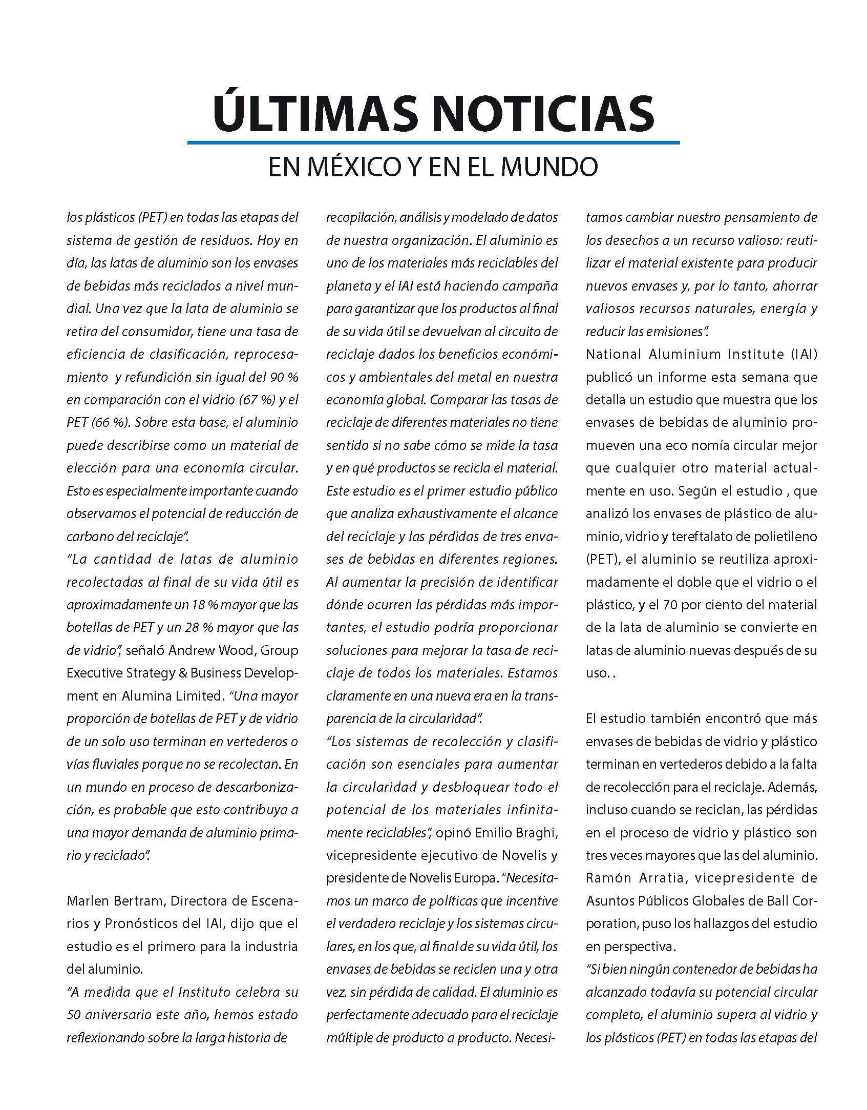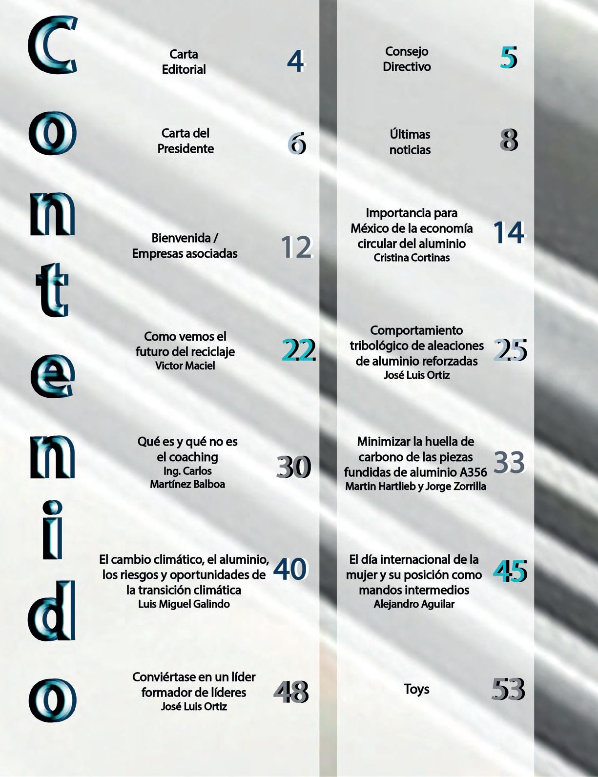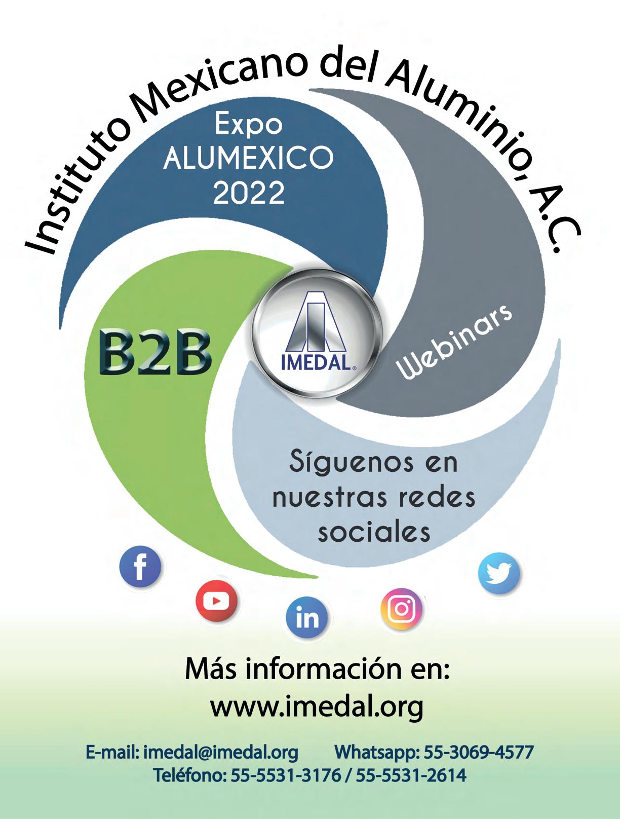 ALUMINIA, año 13, No. 42, Junio-Septiembre 2022, es una publicación cuatrimestral editada por el Instituto Mexicano del Aluminio A.C., calle Francisco Petrarca, 133 Piso 9, Col. Polanco, Alcaldía Miguel Hidalgo, C.P. 11560, Tel: (55) 5531-7892, www.imedal.org, imedal@ imedal.org Editor responsable: Ing. Artemisa Alba Aguilar. Reserva de Derechos al Uso Exclusivo en trámite por el Instituto Nacional del Derecho de Autor, ISSN: en trámite ante el Instituto Nacional del Derecho de Autor. Responsable de la última actualización de este Número, Directora Ejecutiva, Ing. Artemisa Alba Aguilar, calle Francisco Petrarca, 133 Piso 9, Col. Polanco, Alcaldía Miguel Hidalgo, C.P. 11560, fecha de última modificación, 30 de septiembre de 2022.