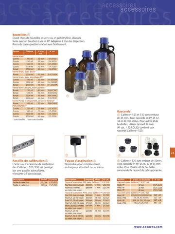 Modèle N° cat. Ø ext. col bouteille Raccords pour Calibrex™ 525/ 530 Fileté, PP 32 mm 1.525.GL32 Fileté, PP 38 mm 1.525.GL38 Fileté, PP 40 mm 1.525.GL40 Raccords pour Calibrex™ 520 / 521 22,25,28,30,34,36,38,40,45mm GLP + Ø Fileté, PP GLT + Ø 36, 38, 40, 45 mm Fileté, PTFE NSP + Ø 18.8, 24, 29.2, 45 mm Rôdé, PP NST + Ø 18.8, 24, 29.2 mm Rôdé, PTFE