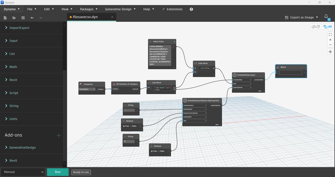 To save time on repetitive tasks, Dynamo scripts are used to automate the quantification export for the Box Culverts, as the design is constantly changing and there are over 150 items to update regularly. The script automatically creates a path for each exported report and saves it in a designated folder. These file paths are then linked in Excel, so there's no need to re-enter data just refresh the Excel file, and it will show the updated numbers based on the exported data.