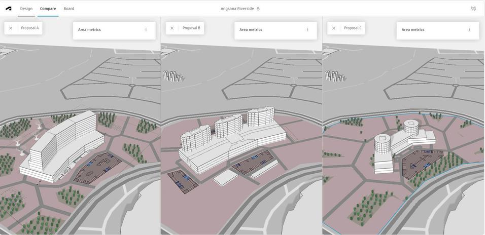 The owner requested a mixed-use building with a podium and towers for a mall, apartments, and office spaces. Using Autodesk Forma, the conceptual design began by shaping the building mass based on site context. Three design proposals were created with different massing options.