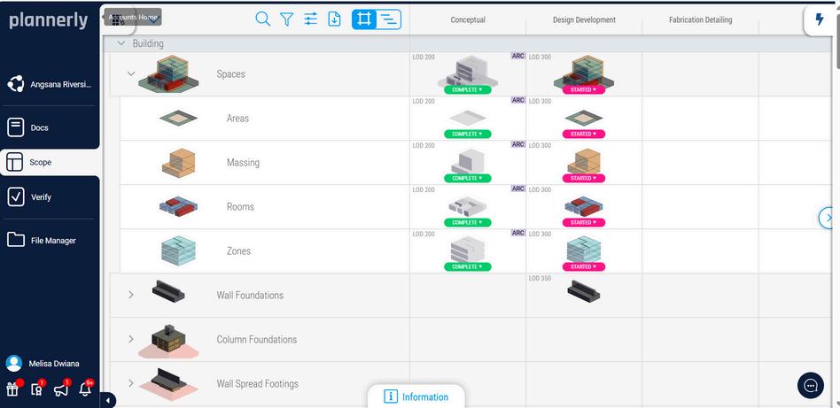 The model was divided into four files, with naming conventions based on the BIM Execution Plan (BEP) created and stored in Plannerly. Progress throughout the project was also documented in Plannerly to track updates and ensure alignment with project goals.