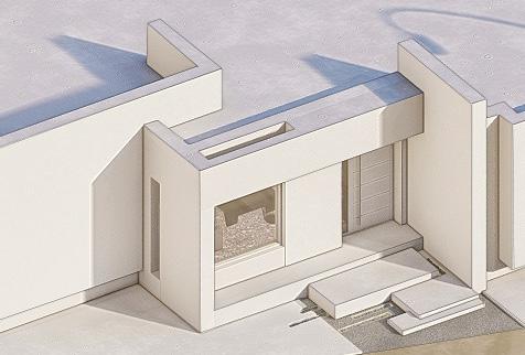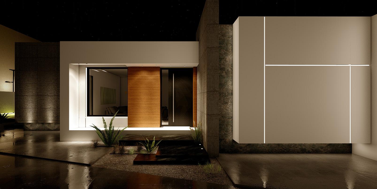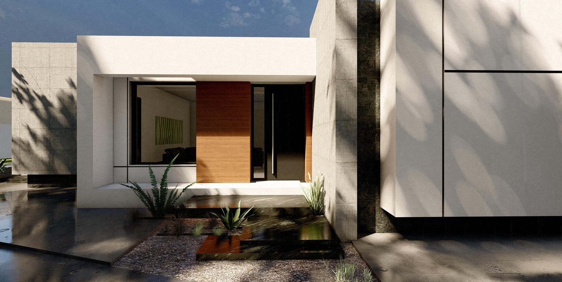 The facade of this one-level house is a striking composition that harmoniously blends white concrete walls with warm wood elements and expansive glass surfaces. This combination of materials creates a dynamic yet cohesive exterior, reflecting a contemporary approach to design that embraces both simplicity and sophistication.