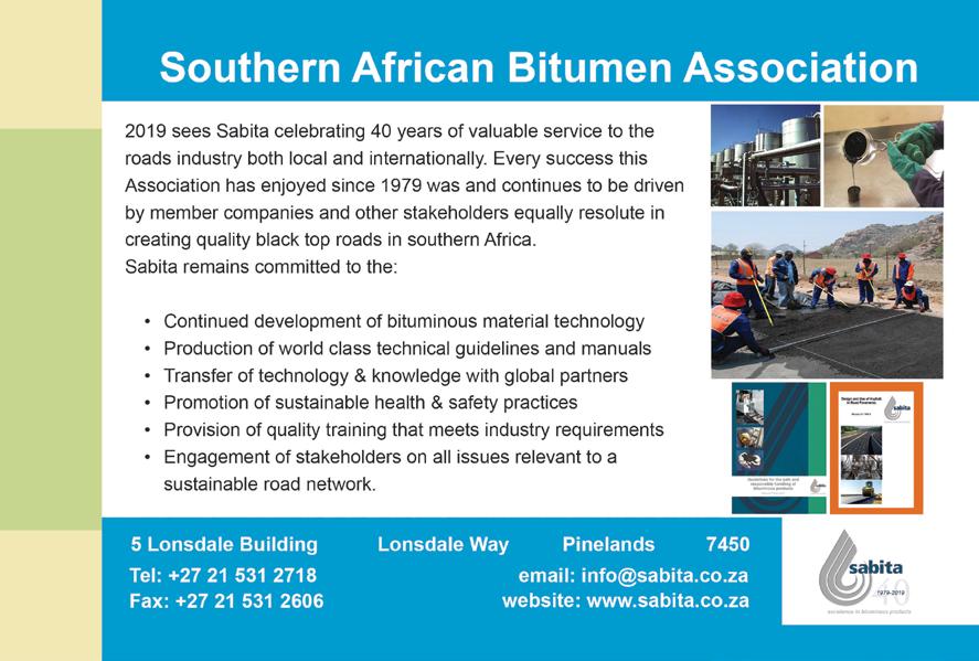 Expanding its range of capabilities year-on-year, Entsika Consulting Services now offers the market a multidisciplinary and integrated range of services encompassing engineering and construction, plant infrastructure asset management, consulting, internal auditing, training and skills development, and enterprise development. P6 volume 44 no. 10 october 2019 Regulars Editor’s comment 3 President’s comment 5 Africa round-up 12 Index to advertisers 79 Cover Story Making a difference by investing in technical excellence 6 Hot Seat Perfecting the grade 10 Industry Insight Always staying ahead 14 Roads & Bridges Start with the best lifetime option 16 Embracing the future today 19 Mogale City Junior Traffic Training Centre gets a revamp 20 Plastic paves the path to new roads 22 Sabita member listing 25 Engineering world-class routes 27 Setting the PG standard 28 A green and versatile course layer 31 Runways Rehabilitating a critical airstrip 32 Partners in Infrastructure Embracing change and innovation 34 Economic lull harming transformation 37 Transport, Logistics, Vehicles & Equipment Ammann’s strategic focus on SMMEs 39 ELB is Ammann’s best compaction dealer 41 Environmental Engineering Going green with gabions 42