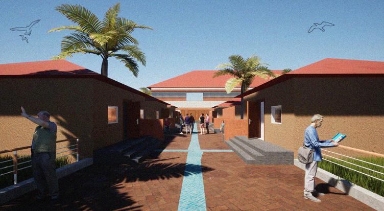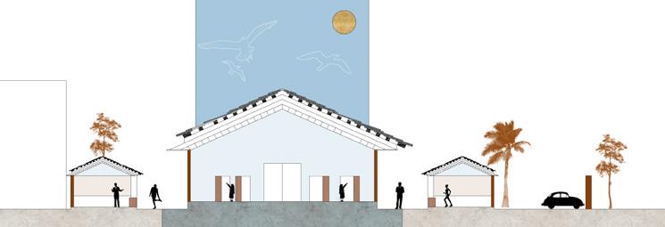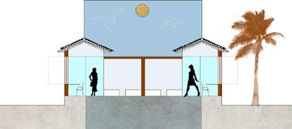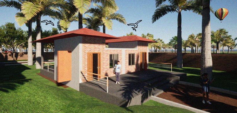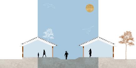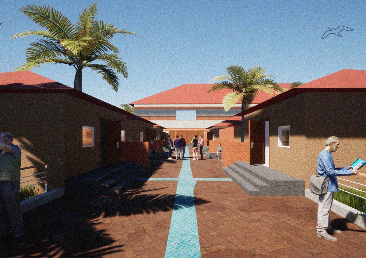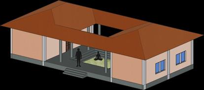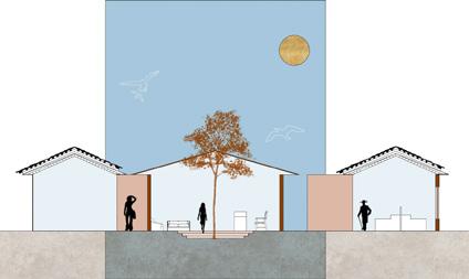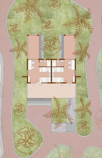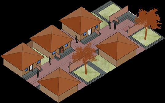 Quad sharing module has a courtyard shared by two houses with a shaded roof to allow the air moment freely and they are oriented towards the windward direction to catch in more with and keep the space ventilated and cool.