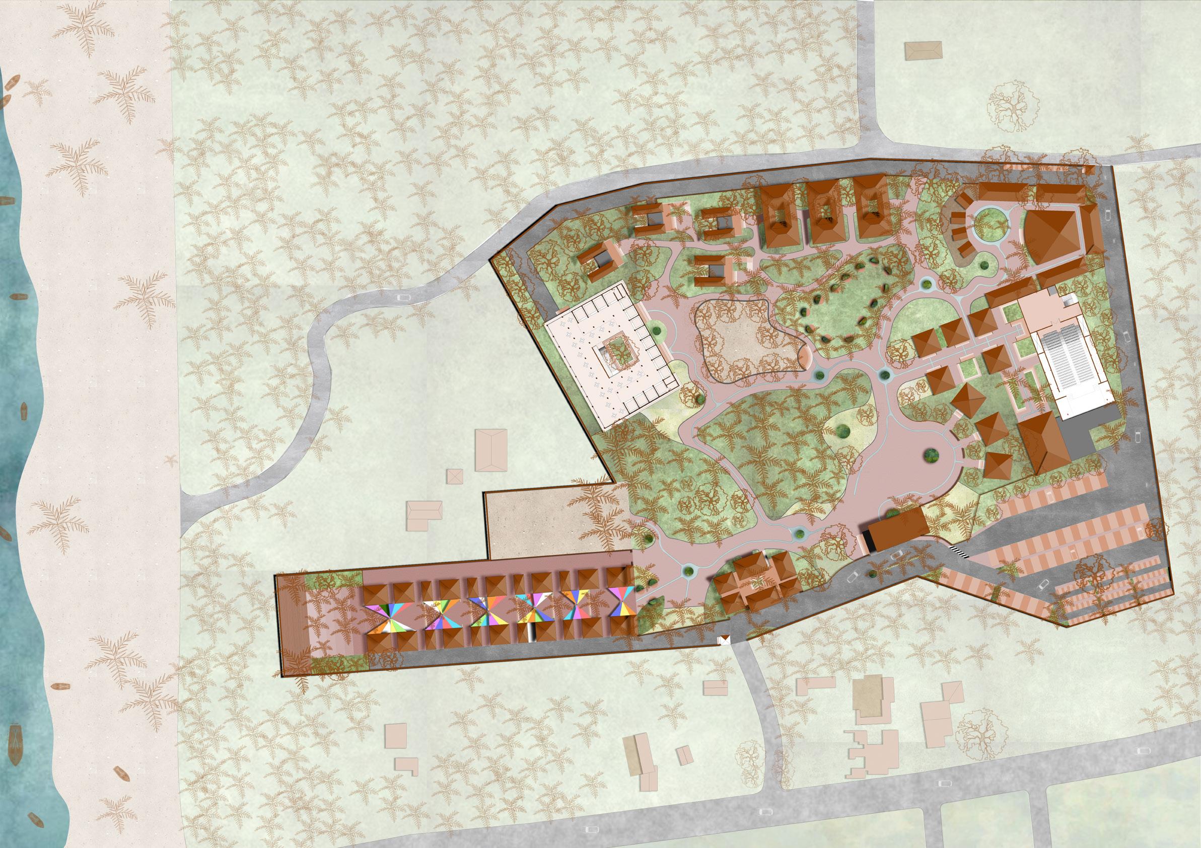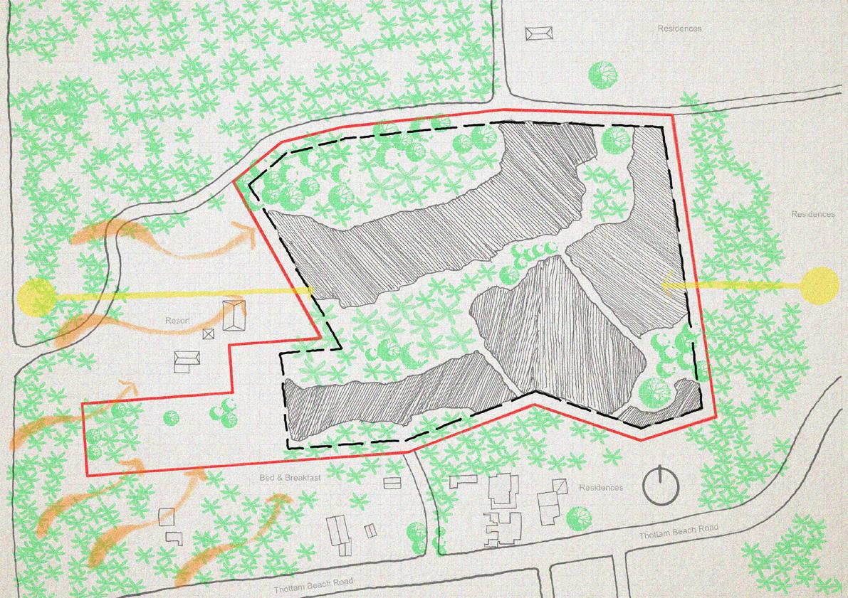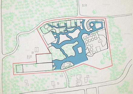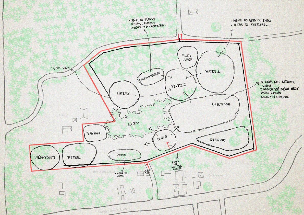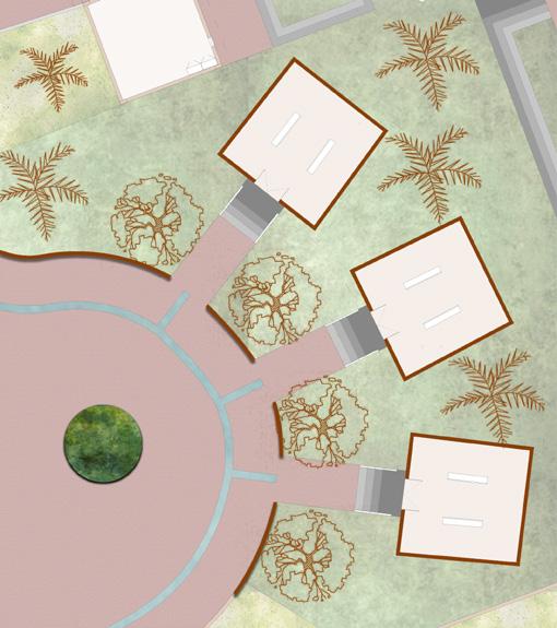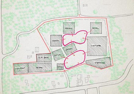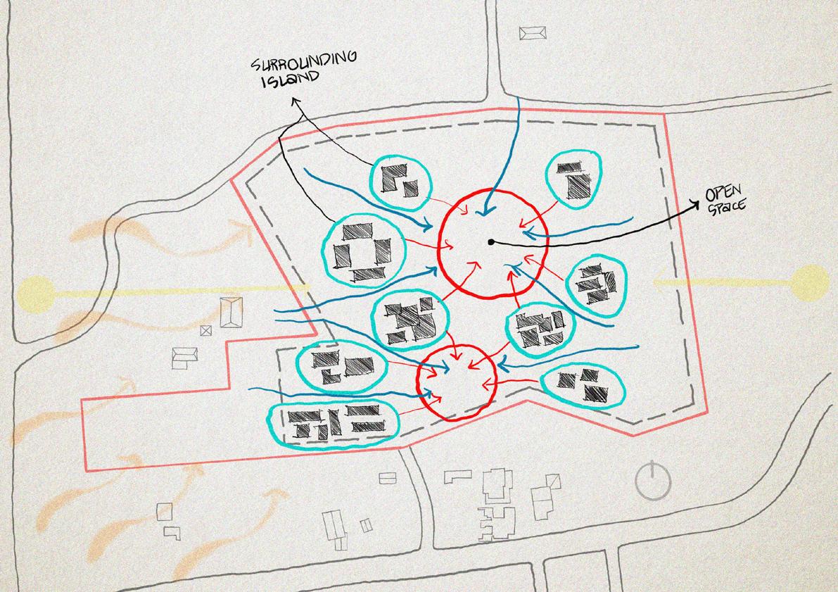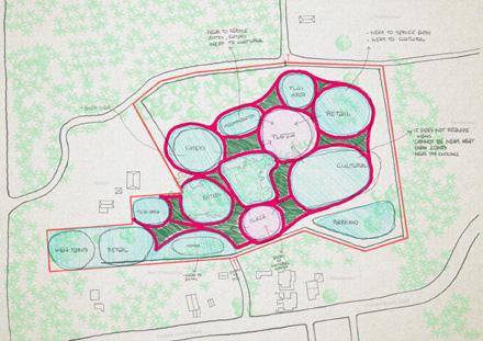 Creating free flowing pathways to enhance the surpricing experience. Using earth berms as an element for visual conncetivity between spaces.