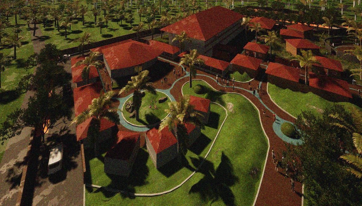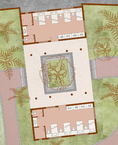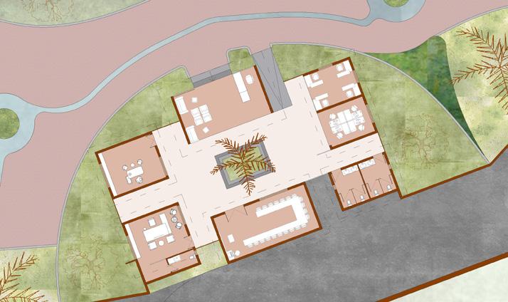 Twin sharing module is designed in such a way that each unit gets a front yard and a back yard which gives different artists to interact with each other, relax, work in open space. Each module has two twin sharing houses.