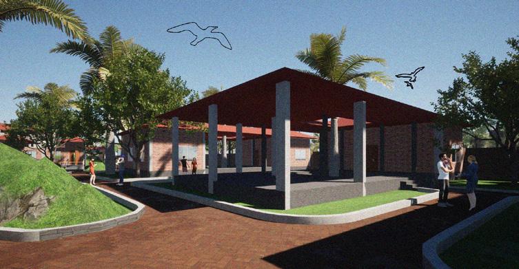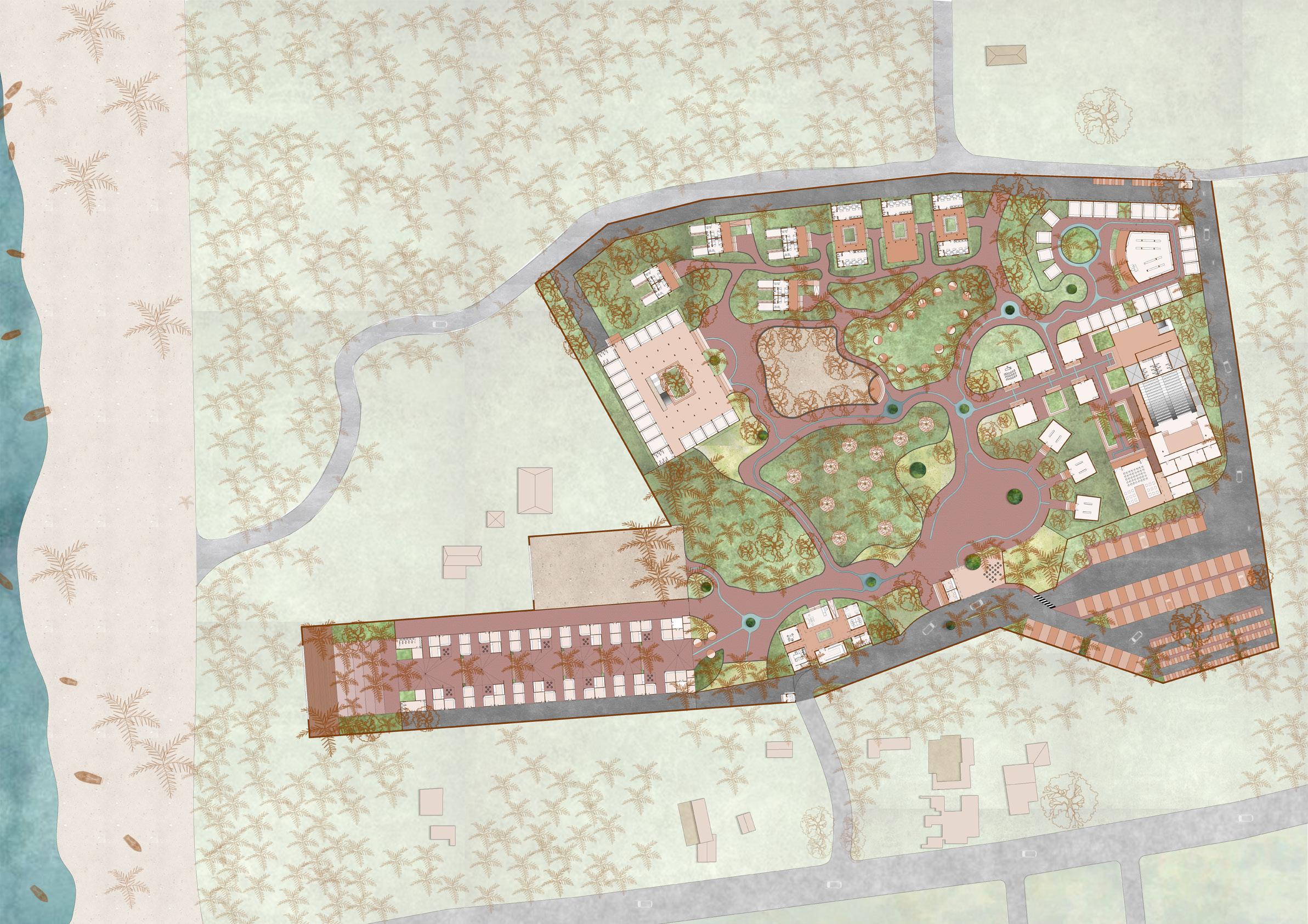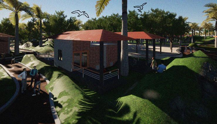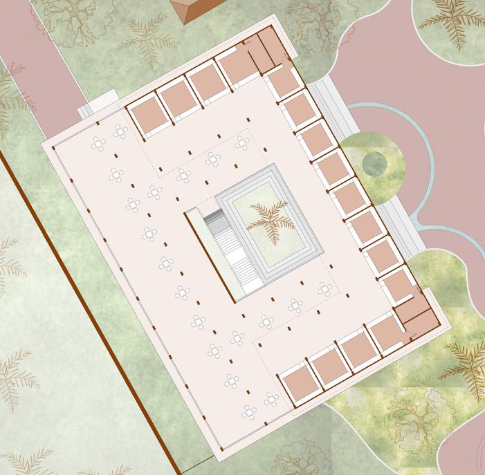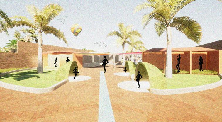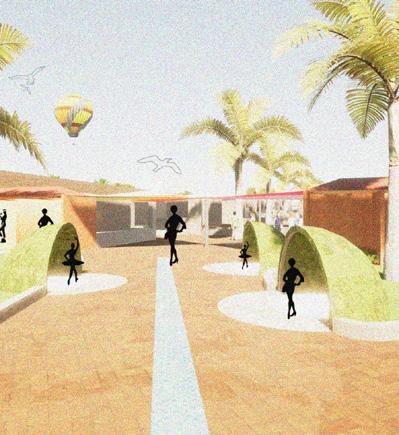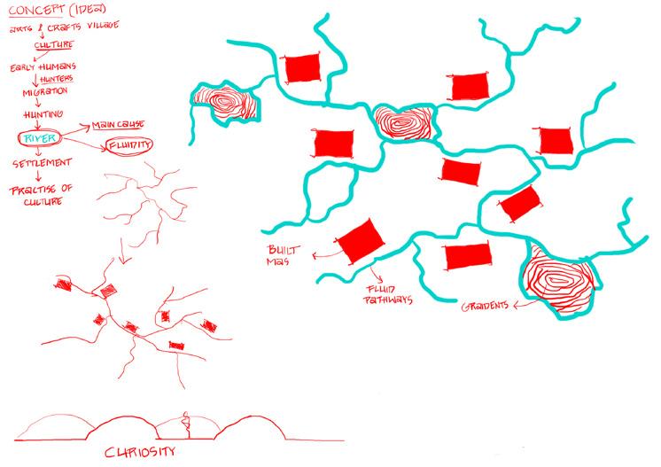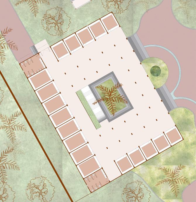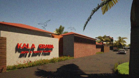 The journey of this retail space come to an end with food, there are few mobile kiosks oriented on the tangent with few mounds in front of them where the tourists can sit and eat of just enjoy. These kiosks are seperated from other space with the help of munds as there is an entry for the artists who come to stay in the complex. This space gives experience of both the street shopping and having food on top of a hill.