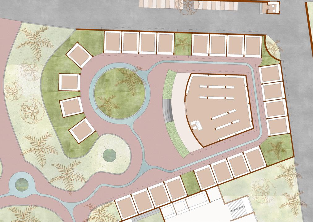 This is an open plaza where there are these semi-berms arranged on the perimeter of the space and all the opening of the berm is concenterated in the center. Any kind of informal events like magic shoes etc. can be conducted over there where the audience is seated inside the berms and the performer stands in the center.
