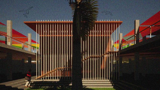 A mix of both open and closed spaces in the street makes it an apt scene of a village and the heavy mass of the auditorium right up straight as they enter the street is seen which becomes the landmark of the area. The heavy mass of the auditorium is lighten by brick cladding at certail heights. Overall it becomes a playful journey from the start as they go from a huge plaza to a frisking space and then a big open space again.