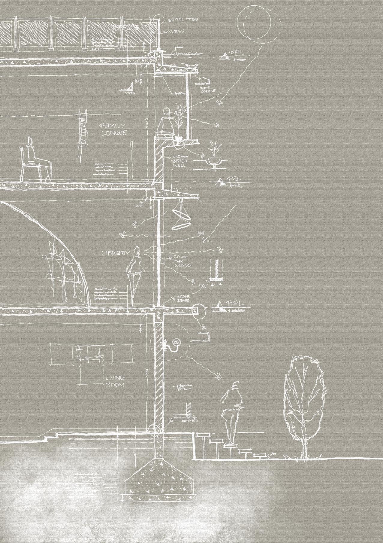AHMEDABAD DRG. TITLE : WALL SECTION DRG. NO. : SEM VI/MZ/WD/ 15 SCALE 1:25 ARCHITECT Mohammed Zain Semester: Roll No.: DATE 20/04/2023 DRAWN BY CHECKED BY DATE COPIES CLIENT ST. ENG. CONTR. ELEC. Zain VI 20WU0401005 PRINTS ISSUED Woxsen School of Architecture & Planning 2 mm THK GLASS RUBBER GRIP 10 40 30 STEEL FRAME DETAIL AT A GLASS RAILING SCALE1:5 30 100 100 STEEL FRAME 2 mm THK GLASS RCC PARAPET DETAIL AT B STEEL FRAME BASE SCALE1:5 DRIP COURSE RCC OVERHANG R10 20 10 10 PLASTER DETAIL AT C DRIP COURSE SCALE1:5 30 mm THK STONE JAMB 20 mm THK GLASS PLASTER RCC LINTEL 110 30 20 DETAIL AT D STONE JAMB SCALE1:5 10 mm THK PLASTER 230 mm THK BRICK WALL 10 mm THK PAINT 10 10 DETAIL AT E BRICK WALL SCALE1:5 SKIRTING FLOORING P.C.C BRICK SOILING BRICK WALL PLASTER 230 75 40 75 DETAIL AT F SKIRTING SCALE1:5 TYPICAL BRICK MASONRY WALL SECTION SCALE1:25 75 mm HIGH SKIRTING 50 mm THK FLOORING · 75 mm THK P.C.C ONE LAYER FLAT BRICK SOILING ONE LAYER POLYTHENE SHEET · 100 mm THK SAND FILLING 150 mm THK HARD CORE · EARTH COMPACTED +0.0 GROUND LVL +750 PLINTH LVL +3750 FINISHED FIRST FLOOR LVL +7350 FINISHED SECOND FLOOR LVL +10,950 TERRACE LVL LIBRARY FAMILY LONGUE TERRACE LIVING ROOM BRICK WORK FOOTING 150 mm THK P.C.C 3380 250 1000 RCC BEAM DRIP COURSE 230 mm THK BRICK WALL 180 30 mm THK STONE JAMB DRIP COURSE 20 mm THK GLASS 30 mm THK STONE JAMB 3170 250 30 1000 70 · 75 mm HIGH SKIRTING 10 mm THK FLOORING · 10 mm THK MORTAR 180mm THK RCC SLAB 230 mm THK BRICK WALL 1000 70 DRIP COURSE RCC BEAM RCC BEAM · 75 mm HIGH SKIRTING 10 mm THK FLOORING 10 mm THK MORTAR · 180 mm THK RCC SLAB 180 mm HIGH PARAPET · 10 mm THK FLOORING 10 mm THK MORTAR · 180 mm THK RCC SLAB 200 mm THK GLASS STEEL FRAME 3420 250 200 910 1000 BRICK WORK AT PLINTH A B C D E F VATA EXPOSED BRICK WORK KEY PLAN SCALE 1:200