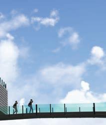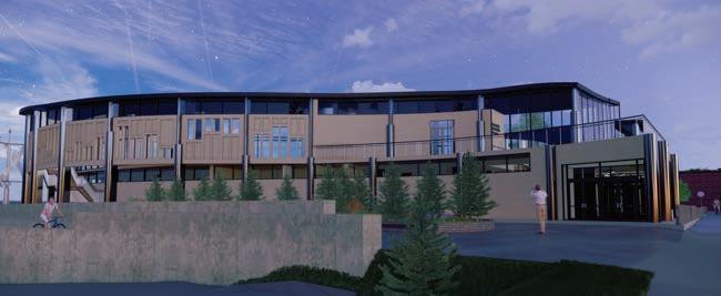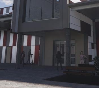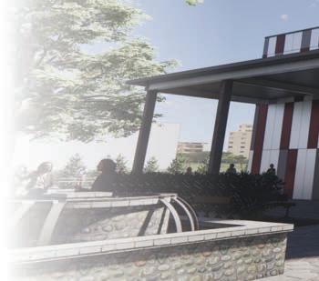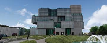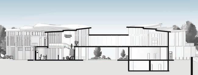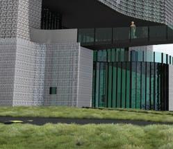 Rendering of the public lobby space in the museum on a clear sunny day