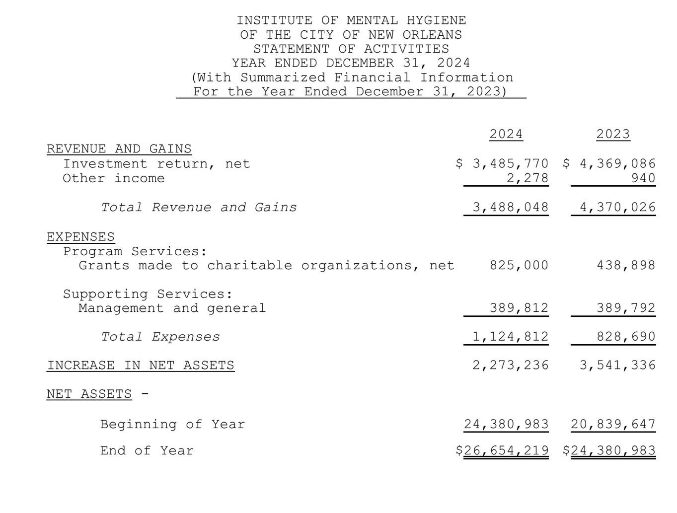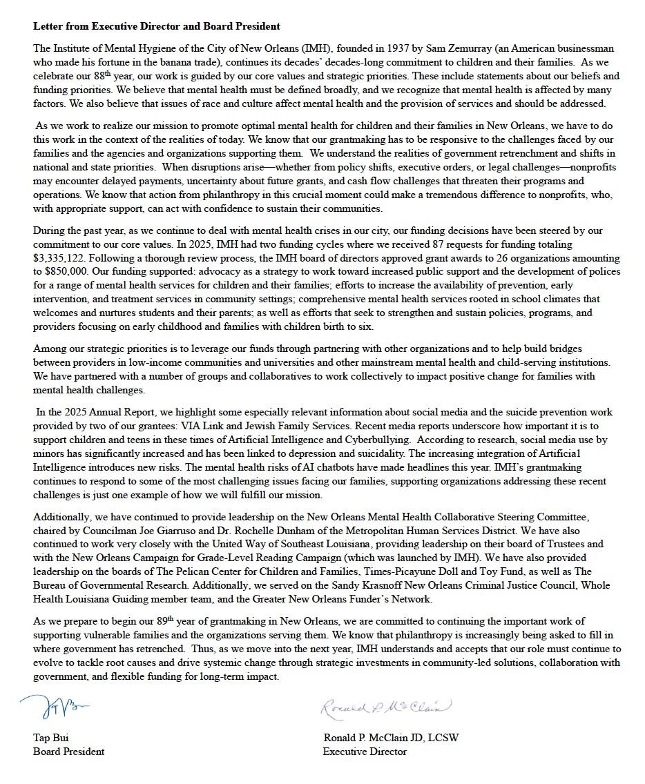 Grant making at IMH is guided by our mission, our core values and by the areas of focus selected by the Foundation. IMH funding is limited, by charter, to Orleans Parish. We do not fund capital projects or individuals. For grant application guidelines, deadlines, and details, please visit www.imhno.org.