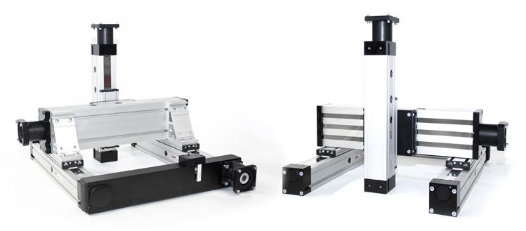 Zahnriemengetriebene Linearachsen mit quadratischem Aluminiumprofil.
