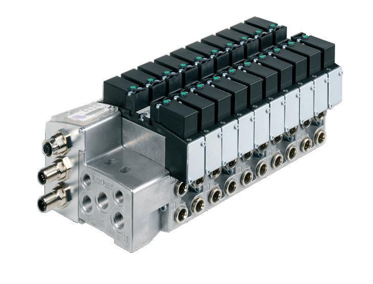 El módulo de válvula piloto mantiene la clase de protección IP67 de la variante de línea limpia. La instalación del cliente se simplifica enormemente, con un solo conector M12 para las válvulas piloto y los interruptores, y puertos de aire y escape únicos.