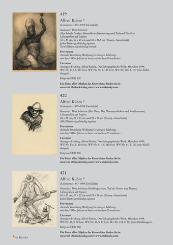 419 Alfred Kubin * (Leitmeritz 1877–1959 Zwickledt) Konvolut: Drei Arbeiten (Der blinde Pauker, Menschheitsdämmerung und Tod und Tischler) Lithografien auf Papier; 32 × 27 cm, 46 × 41 cm und 40 × 30,5 cm (Passep.-Ausschnitt) Jedes Blatt eigenhändig signiert Zwei Blätter eigenhändig betitelt Provenienz ehemals Sammlung Wolfgang Graninger, Salzburg; seit den 1980er Jahren in österreichischem Privatbesitz Literatur Annegret Hoberg, Alfred Kubin. Das lithographische Werk, München 1999, WV-Nr. 142, S. 221 bzw. WV-Nr. 78, S. 145 bzw. WV-Nr. 108, S. 177 (mit Abbildungen) Rufpreis EUR 500 Die Fotos aller Objekte des Konvolutes finden Sie in unserem Onlinekatalog unter www.imkinsky.com.