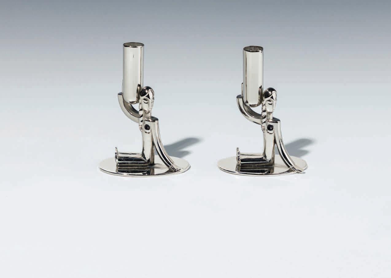 Diese Leuchter, die auch als Blumenvasen genutzt werden können, wurden in zwei Größen ausgeführt – einer größeren sowie der hier vorliegenden kleineren Variante. Beide Ausführungen sind auf einer historischen Aufnahme des Verkaufslokals der Wiener Werkstätte in einer Vitrine zu erkennen. (MB)