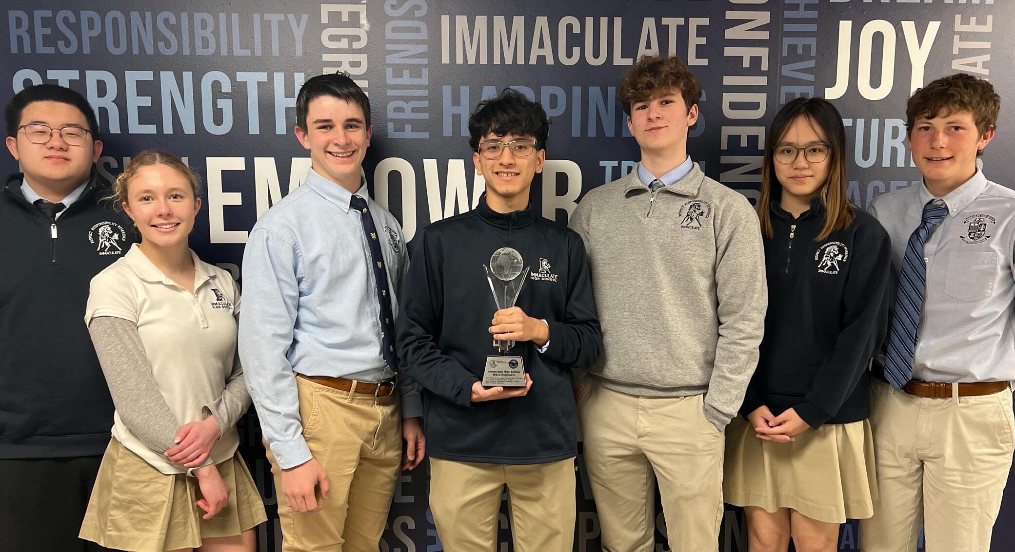 Immaculate’s Mock Trial Club is a great way to introduce Mustangs to our legal system and courtroom rules. In this program, students take on the roles of attorneys, witnesses and jurors, working together to prepare and present a fictional case. Every year, the Connecticut State Bar hosts a Mock Trial Competition in courtrooms across the state which includes 50 teams. Immaculate’s squad won the regional competition held in Danbury, becoming one of the 20 teams in the next round held in Bridgeport. The team advanced again to compete in the quarter final held in Middletown. In that round, Immaculate’s Mock Trial Team narrowly lost with one judge voting for them and two other judges voting for another school. “The team that defeated us, Sheehan High School in Wallingford, eventually went on to become the overall champion, so we do not feel too bad about losing to them,” said Faculty Moderator Christopher Houser. “I’m so proud of the way our Mock Trial students performed!”
