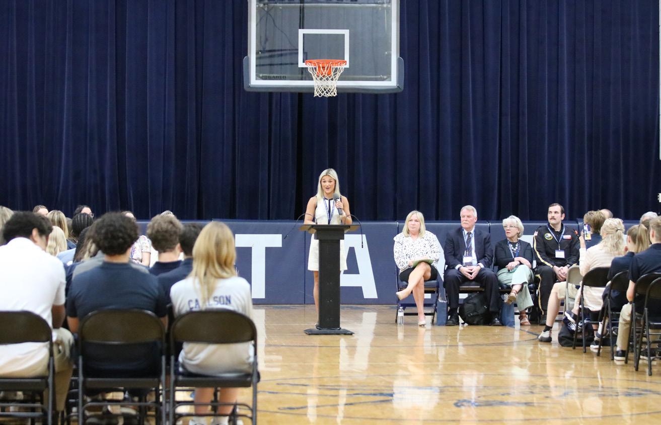 The Most Reverend Frank J. Caggiano, Bishop of Bridgeport, spoke at the school’s Eucharistic Adoration service held in the gymnasium. The ceremony marked Catholics’ belief that Jesus is truly present–body, blood, soul and divinity–in the Eucharist and was a time for the whole school community to honor and adore Him. The event was part of the Bridgeport Diocese’s 2024 Greater Danbury Eucharistic Procession.