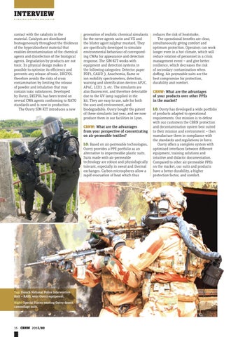 generation of realistic chemical simulants for the nerve agents sarin and VX and the blister agent sulphur mustard. They are specifically developed to simulate environmental behaviour of corresponding CWAs for appearance and detection response. The SIM-KIT works with equipment and detection systems in the following categories: Detector paper PDF1, CALID 3, Anachemia, flame or ion mobility spectrometers, detection, warning and identification devices AP2C, AP4C, LCD3 .3, etc. The simulants are also fluorescent, and therefore detectable due to the UV lamp supplied in the kit. They are easy to use, safe for both the user and environment, and biodegradable. Ouvry bought the patent of these simulants last year, and we now produce them in our facilities in Lyon. CBNW: What are the advantages from your perspective of concentrating on air-permeable textiles? LO: Based on air-permeable technologies, Ouvry provides a PPE portfolio as an alternative to impermeable plastic suits. Suits made with air-permeable technology are robust and physiologically tolerant, especially in sweat and thermal exchanges. Carbon microspheres allow a rapid evacuation of heat which thus