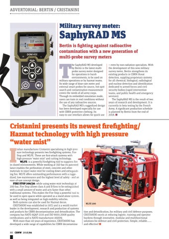 talian alian manufacturer Cristanini specialising in high-pressure technology presents two firefighting systems, Fire Stop and WJ.FE. These are first-attack systems with high-pressure ‘water mist’ and cutting technology. WJ.FE:: is a powerful firefighting tool to suppress fire in closed environments. While working at 350 bar its patented lance enables the perforation of steel, concrete and other materials to inject water mist for cooling down and extinguishing fire. WJ.FE offers outstanding performances with a ruggedized, low-maintenance and the highest level of safety - and an ease-of-use concept design. FIRE STOP 200/30:: while using water-mist technology at 200 bar, Fire Stop allows class A and B fires to be extinguished with a small amount of water and acts faster than other traditional systems. This makes the Fire Stop a powerful tool to be used in open spaces while operated as a stand-alone system, as well as being integrated on high-mobility vehicles. Both systems can also be used for Hazmat decon. CRISTANINI was established in 1972 and is a world market leader in the development, research and production of systems and products for CBRN decontamination and detoxification. The company has NATO AQAP 2110 and ISO 9001:2008 quality certifications and is NATO manufacturer A5009. With more than 40 years of experience, CRISTANINI has developed a wide range of capabilities for CBRN decontamina88 CBNW 2018/01