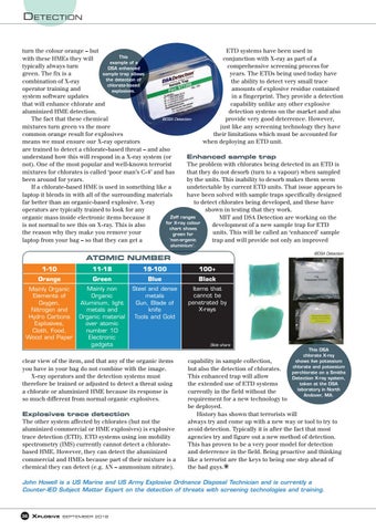 ETD systems have been used in turn the colour orange – but This conjunction with X-ray as part of a with these HMEs they will example of a comprehensive screening process for typically always turn DSA enhanced years. The ETDs being used today have green. The fix is a sample trap allows the detection of the ability to detect very small trace combination of X-ray chlorate-based amounts of explosive residue contained operator training and explosives. in a fingerprint. They provide a detection system software updates capability unlike any other explosive that will enhance chlorate and detection systems on the market and also aluminized HME detection. ©DSA Detection provide very good deterrence. However, The fact that these chemical just like any screening technology they have mixtures turn green vs the more their limitations which must be accounted for common orange result for explosives when deploying an ETD unit. means we must ensure our X-ray operators are trained to detect a chlorate-based threat – and also understand how this will respond in a X-ray system (or Enhanced sample trap not). One of the most popular and well-known terrorist The problem with chlorates being detected in an ETD is mixtures for chlorates is called ‘poor man’s C-4’ and has that they do not desorb (turn to a vapour) when sampled been around for years. by the units. This inability to desorb makes them seem If a chlorate-based HME is used in something like a undetectable by current ETD units. That issue appears to laptop it blends in with all of the surrounding materials have been solved with sample traps specifically designed far better than an organic-based explosive. X-ray to detect chlorates being developed, and these have operators are typically trained to look for any shown in testing that they work. Zeff ranges organic mass inside electronic items because it MIT and DSA Detection are working on the for X-ray colour is not normal to see this on X-ray. This is also development of a new sample trap for ETD chart shows the reason why they make you remove your units. This will be called an ‘enhanced’ sample green for ‘non-organic laptop from your bag – so that they can get a trap and will provide not only an improved aluminium’.