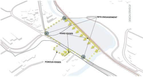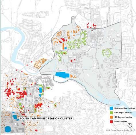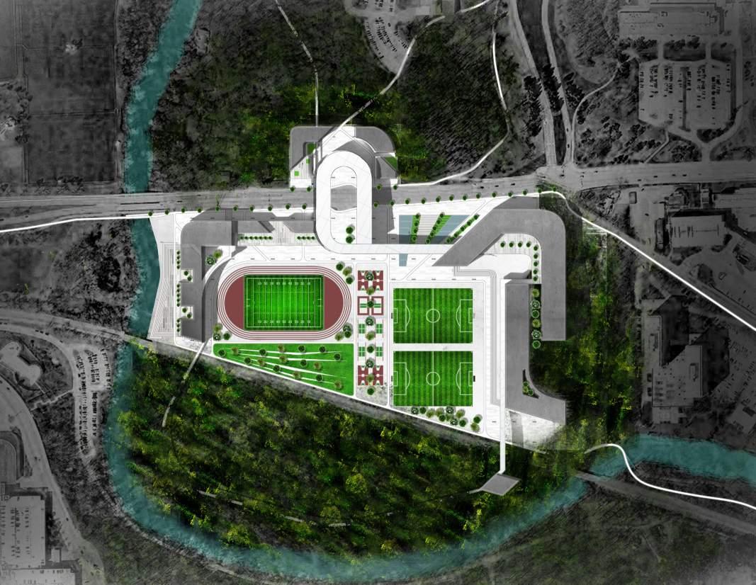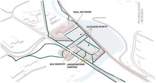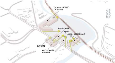 The location of A Fuller North Campus and existing trails leading to university campuses and Ann Arbor communities create an op portunity for the site to become a center for a more pedestrian and bike-centric campus as one of the more pressing issues of North Campus is it’s car-centric layout. Site analysis such as existing soccer fields, parking lots, infrastructure and surrounding programs resulted in the proposal for a mixed-use program containing staff, student and faculty housing, a day-care center, indoor and outdoor recre ational centers, a continuous pedestrian and bike paths, underground parking, shops, restaurants, markets and a riverfront access zone.