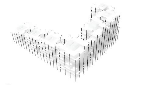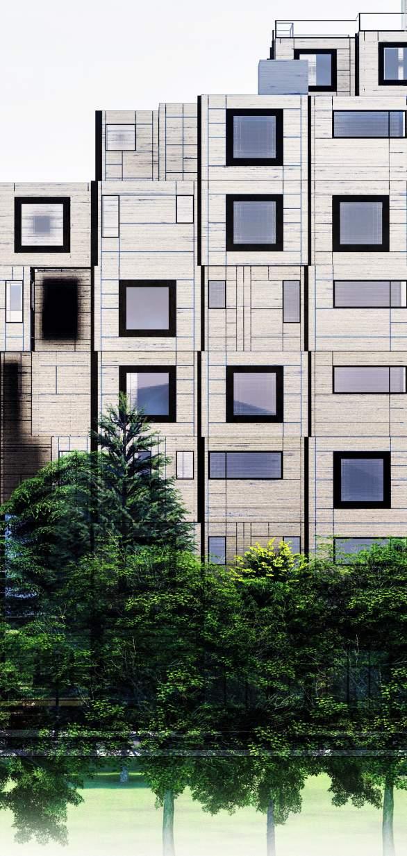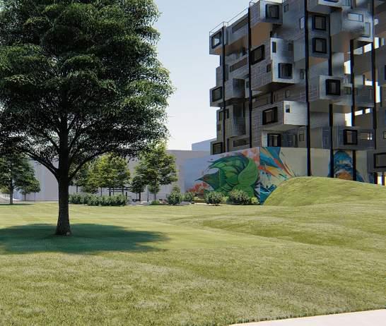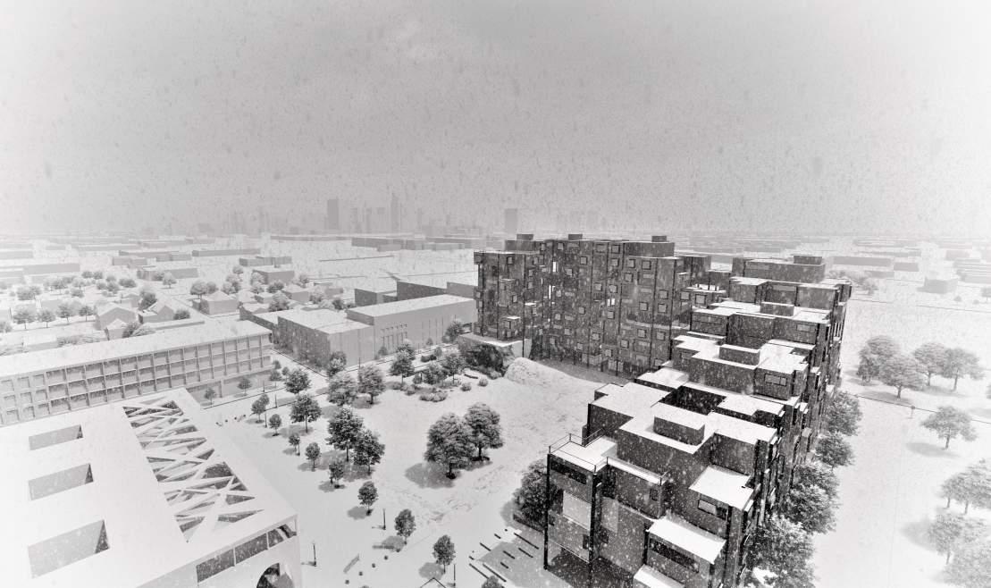 Our main program, NoCoTo Apartments, is desinged to be an affordable housing both for incoming Ford employees and the people within North Corktown. The integration and aggregation of seven towers comprised of a vertical core and units create an effect of a parts-to-whole design approach. In an effort to allow sunlight into the park, we conceived our housing to be light and porous while decreasing in height as it approaches the market. The systems approach to our design includes seven vertical circulation cores and a grid system providing structural support to the apartment units which are lifted above ground to activate the ground space as a night zone to contrast the park as a day zone. The ver tical cores, beyond being structural elements to our project, are also equipped with the building’s electrical, plumbing, heating, and water supply systems. Located underground, the parking basement provides parking for the tenants as well as storage for energy systems. By puncturing openings above ground and planting trees into the transition space from the building ground floor and the park, we are providing ventilation and visual aesthetics to the underground parking as well as the park. The design, structure and location of NoCoTo Apartments and our mixed use mid density approach to the neighborhood expresses our passion to elevate and nourish the current North Corktown and the community.