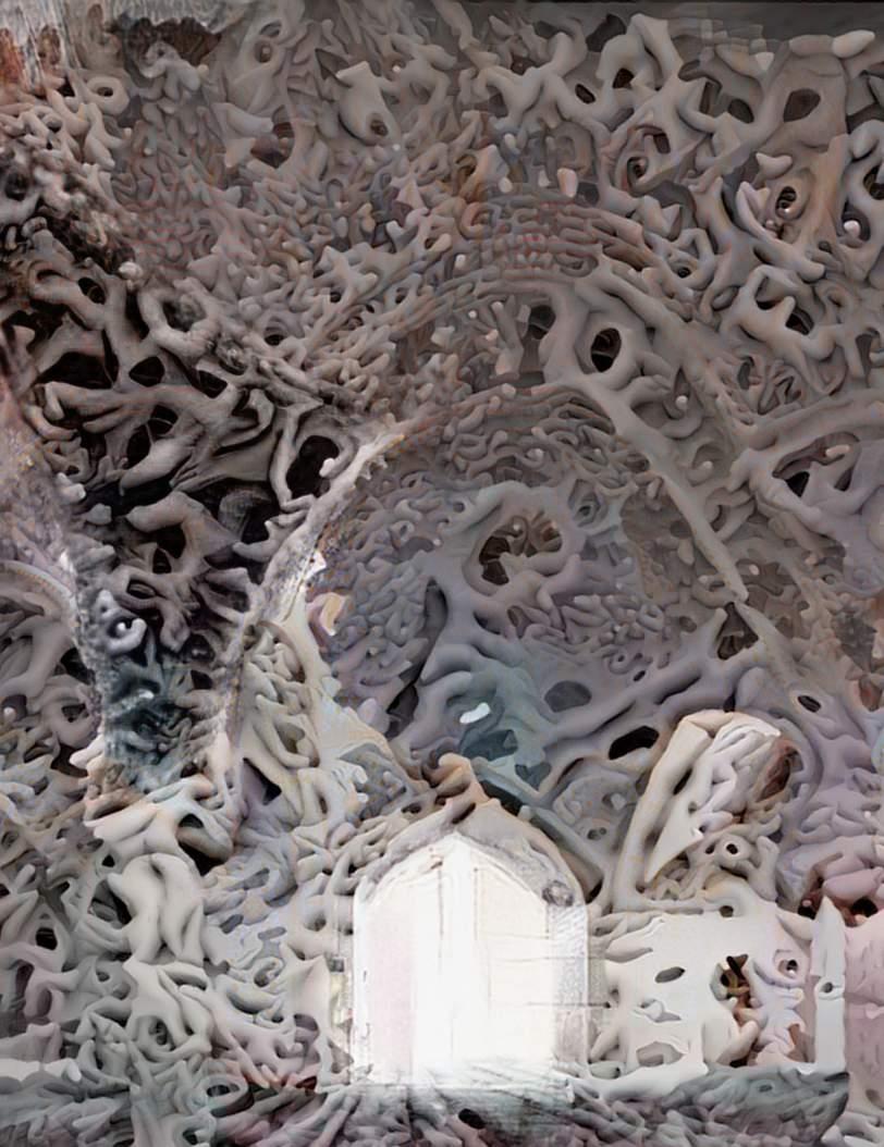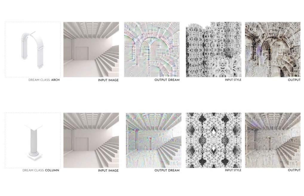 After successfully training our image classification model through python coding, the trained network model is then implemented into two generative adversarial networks (GAN) or generative classes of machine learning: Deep Dream and cycleGAN. These two network models produce dreams, or machine hallucinations, which are visual representations what our neural network “thinks” of as the essence of objects. With a system of this nature, we begin to speculate how an integrated pair ing of artificial intelligence and architectural authority would revolutionize the creative process of architecture.