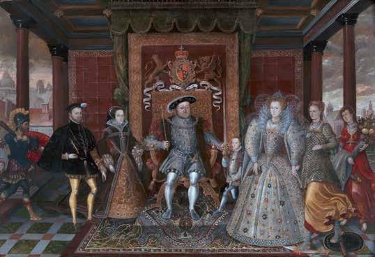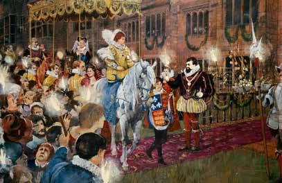 LEFT: Elizabeth’s cousin and lady of the bedchamber, Katherine Knollys, sometimes found herself at the receiving end of the queen’s fiery temper BELOW: A c1590 painting imagines the late Henry VIII alongside his heirs. Decades after his death, the king was fondly remembered for his fight against Rome Elizabeth’s Catholic half-sister, Mary (r1553–58), had been the first queen of England to reign in her own right Queen Elizabeth I depicted in procession with her courtiers, c1600–03. The monarch regularly went out and visited different parts of her realm, giving subjects the chance to see her in person