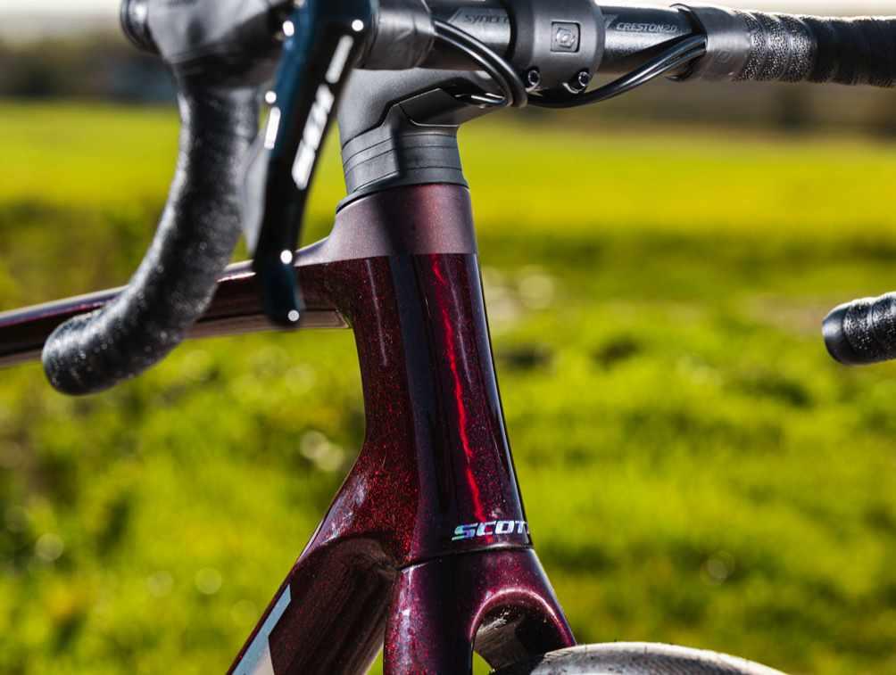 The somewhat ungainly over-thetop-of-the-stem cable routing is now gone, along with the bolt-on cover and flexible headset spacers. In its place is the new cable-routing system OverDrive Aero. This sees all cables and hoses routed internally through the handlebar before running under the stem and into the frame in front of the steerer tube, and is designed to make it easier to adjust the fit of components such as the stem.